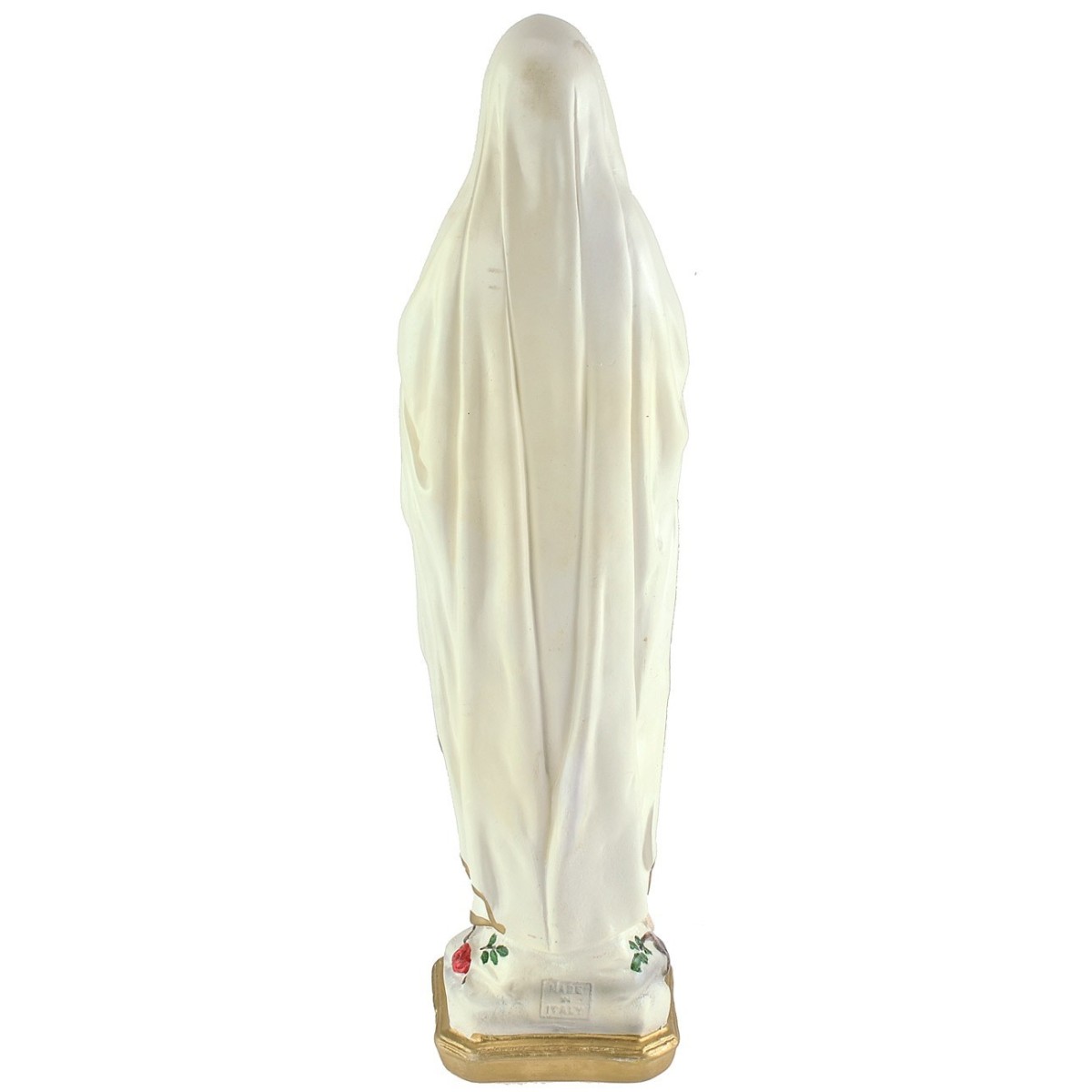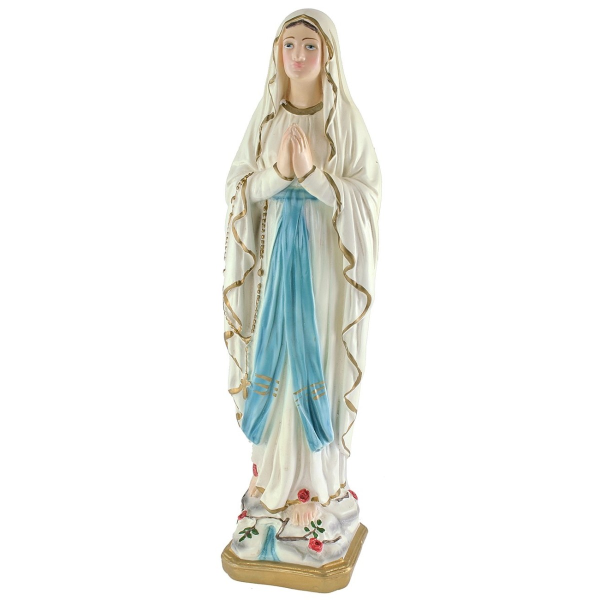 Our Lady of Lourdes in hand-painted resin, 41.5 cm high, the statue is well finished and rests on a stone pedestal adorned with a branch of roses. The Virgin dressed in white is in an upright position, with her hands clasped in prayer and a golden rosary hanging on her arm. This item was handcrafted.