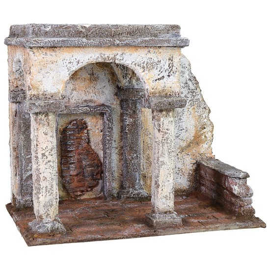 Setting representing the flagellation of Christ. The structure is white with large arches and is in Arabic style, on the back a small door, while in front the columns to which Jesus was bound and scourged. The scene is suitable for 9 cm or 10 cm high statues available in related products, l The setting is sold empty without statues and the complete images are for illustrative purposes only. The article was produced in Italy by skilled craftsmen with polystyrene, wood and cork.