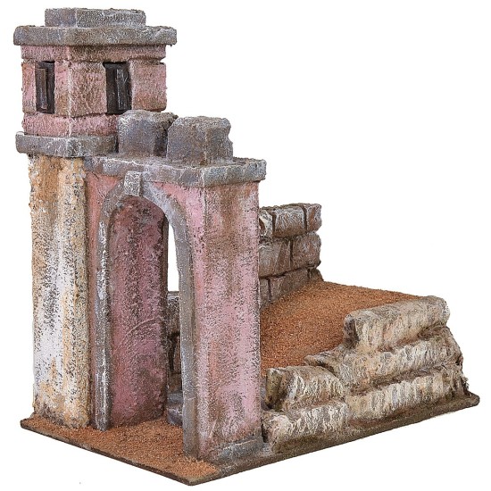 Setting that represents a stretch of road traveled by Jesus with the cross on his back. The product is part of a modular and customizable series, the object in particular represents the exit from the city gate with the beginning of an uphill journey towards Monte Calvario. Stage is suitable for 9cm or 10cm tall statues available in related products, stage is sold empty without statues and full images are for illustrative purposes only. The article was produced in Italy by skilled craftsmen with polystyrene, wood and cork.
