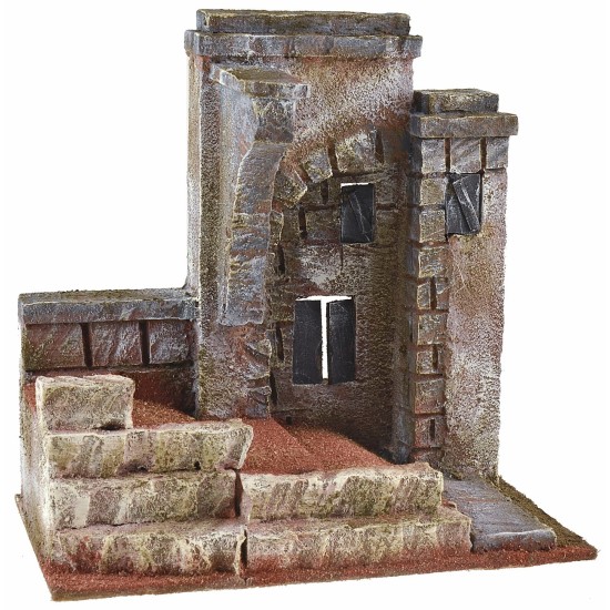 Setting that represents a stretch of road traveled by Jesus with the cross on his shoulders. The product is part of a modular and customizable series, and the object in particular represents a glimpse of an old building in front of which he passed on his painful uphill journey towards Calvary. The scenery is suitable for statues of 9 cm or 10 cm in height, available in related products; the scenery is sold empty without statues, and the complete images are purely illustrative. The article was produced in Italy by skilled artisan hands using polystyrene, wood, and cork.
