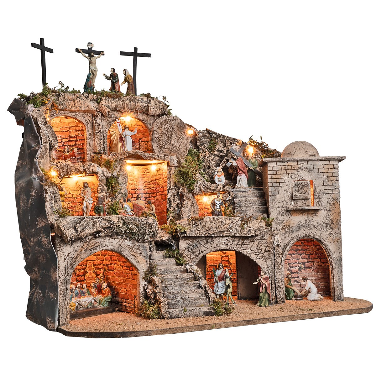 Illuminated Easter diorama, complete with 9 cm series resin figurines depicting nine scenes of the Passion of Christ. Handcrafted in Italy with wood, cork, and moss, it features a multi-level structure that creates a visual narrative capable of guiding the observer through the most significant moments.
