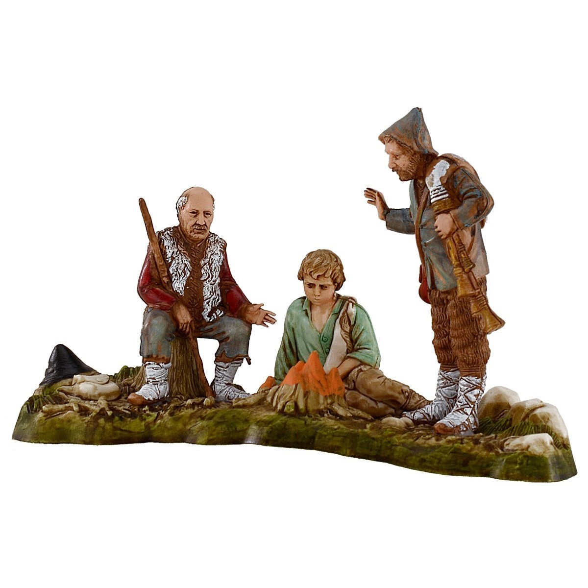 Tre uomini intorno al fuoco, scena per presepe serie Landi Moranduzzo 10 cm. Si precisa che la sopracitata serie misura realmente circa 8,5-9 cm di altezza. Le statue di questo marchio si caratterizzano per la cura nell'espressività dei volti e di ogni singolo dettaglio, infatti tutte le serie firmate Landi sono prodotte e dipinte a mano in Italia.
