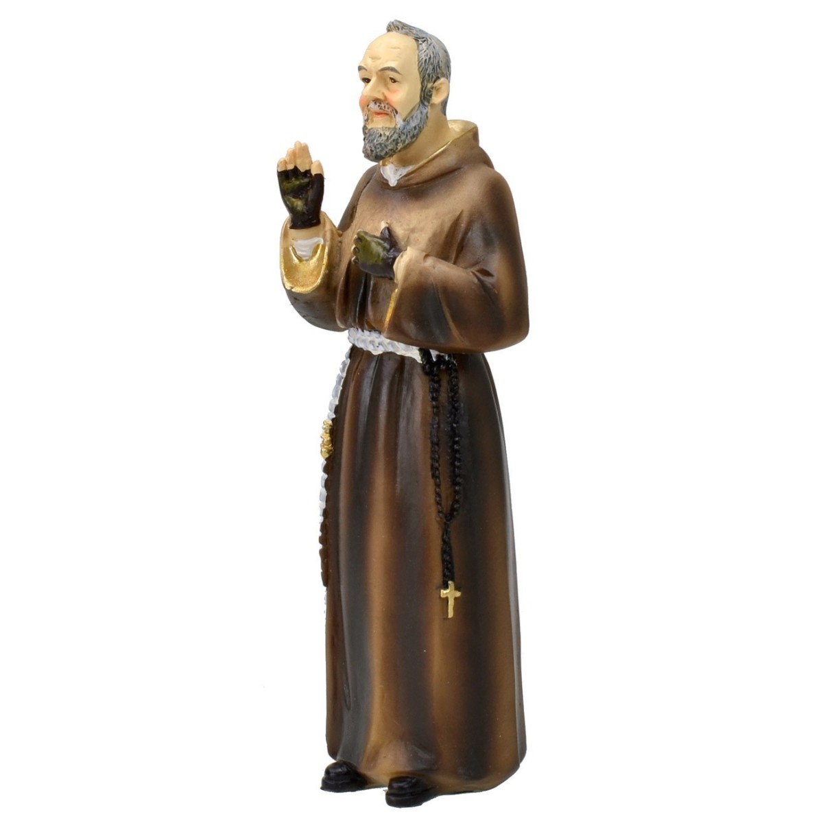 Padre Pio in resina e alto 13 cm. La statua riproduce nei particolari la figura del Santo da Pietrelcina, dal volto molto somigliante ed espressivo con capelli e barba bianca; al saio dei frati cappuccini indossato con la corda a cui è allacciato il tau. Le mani sono coperte da guantini neri per nascondere le stigmate e sono posizionate : la destra in segno di benedizione, mentre la sinistra sul cuore. San Pio visse una vita in malattia e sofferenza, trovò in un primo momento refrigerio nel convento a San Giovanni Rotondo dove poi restò per il resto della sua vita e venne raggiunto da visioni, dalla trasverberazione e stimmate.