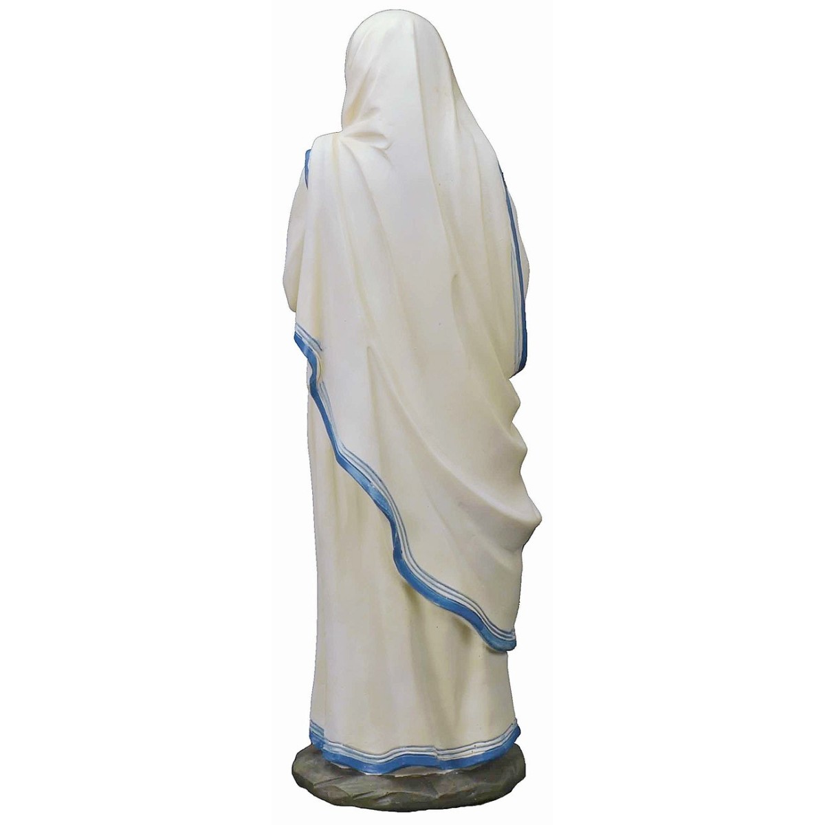 Santa Madre Teresa di Calcutta, albanese di nascita ma naturalizzata indiana. Fonda il suo ordine religioso delle Missionarie della Carità per cui sceglie come abito un semplice sari bianco a strisce azzurre, colore utilizzato dalla casta più povera degli intoccabili. La Santa, anche premio Nobel per il suo impegno verso i più poveri tra i poveri, è rappresentata in posizione eretta con le mani incrociate in preghiera. La statua misura 27,5 cm ed è in resina dipinta a mano ben rifinita nei dettagli.