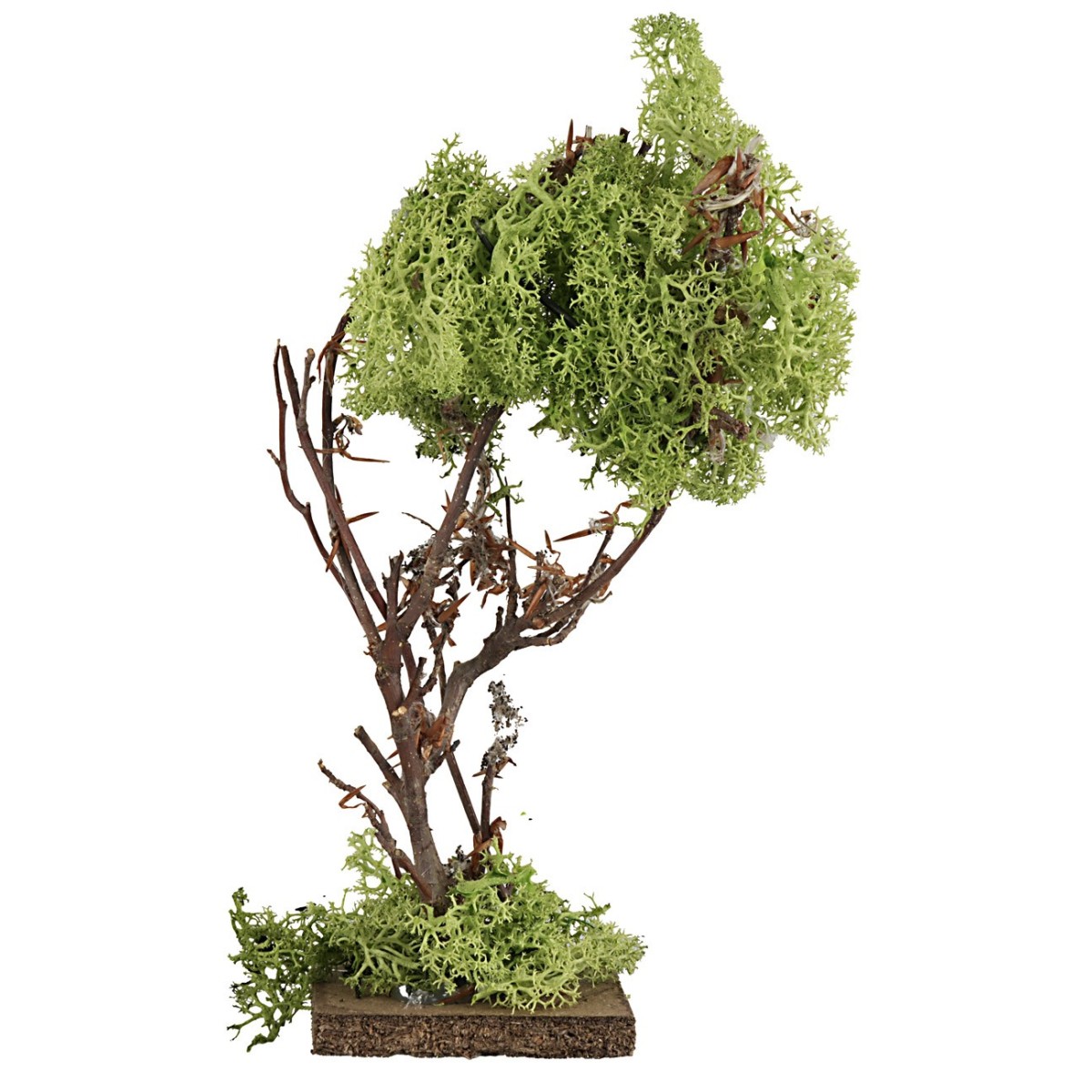 Green tree with a square wooden base, suitable for nativity scene modeling. The 18.5 cm tall plant is handcrafted and produced from wood and lichen, finished in the finest details, perfect for making settings even more immersive and realistic.