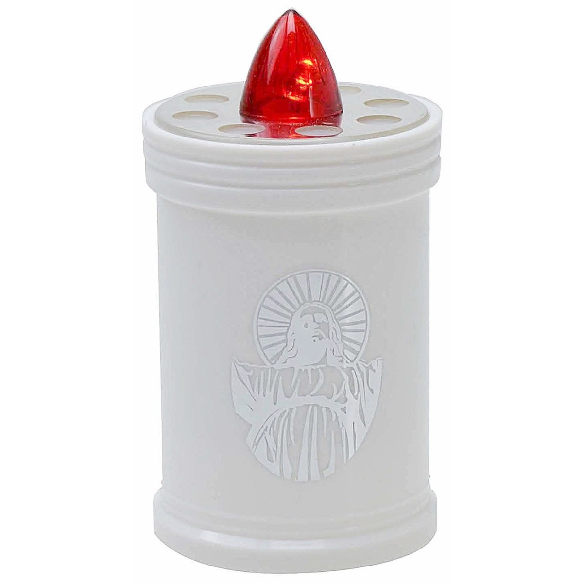 White votive candle with fixed red flame powered by batteries (non-replaceable included) with an estimated duration of 120 days. A label depicting Christ the Redeemer completes the product.