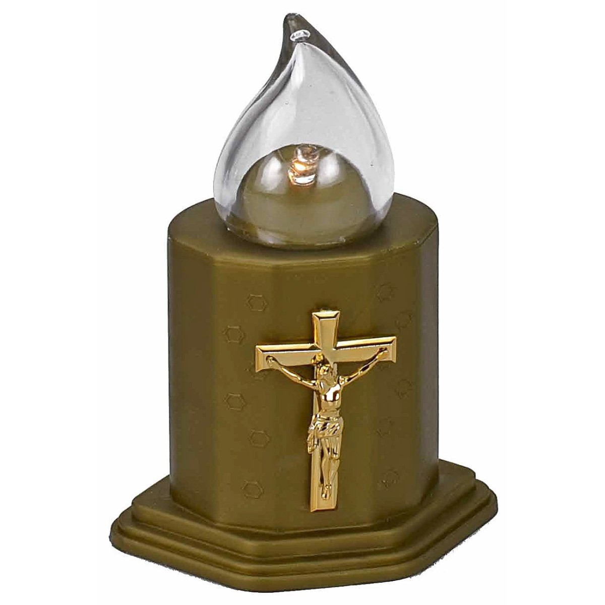 Lumino votivo con Cristo in croce formato 3D color oro, fiamma a goccia illuminata da led bianco caldo tremolante funzionante a batterie (incluse e sostituibili) della durata stimata in 150 giorni.