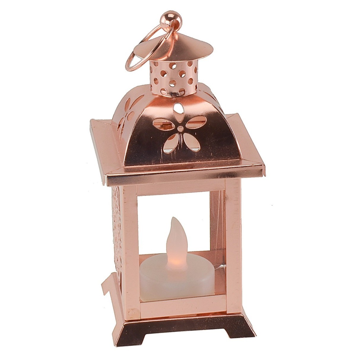 Copper-colored metal lantern with two sides decorated with silk-screen printing as well as flowers printed on the dome, is complete with a candle with a flame illuminated by a flickering light. This illuminated furnishing accessory gives warmth to the atmosphere and is suitable for being placed in any environment as it runs on batteries (included and replaceable CR2032X1).
