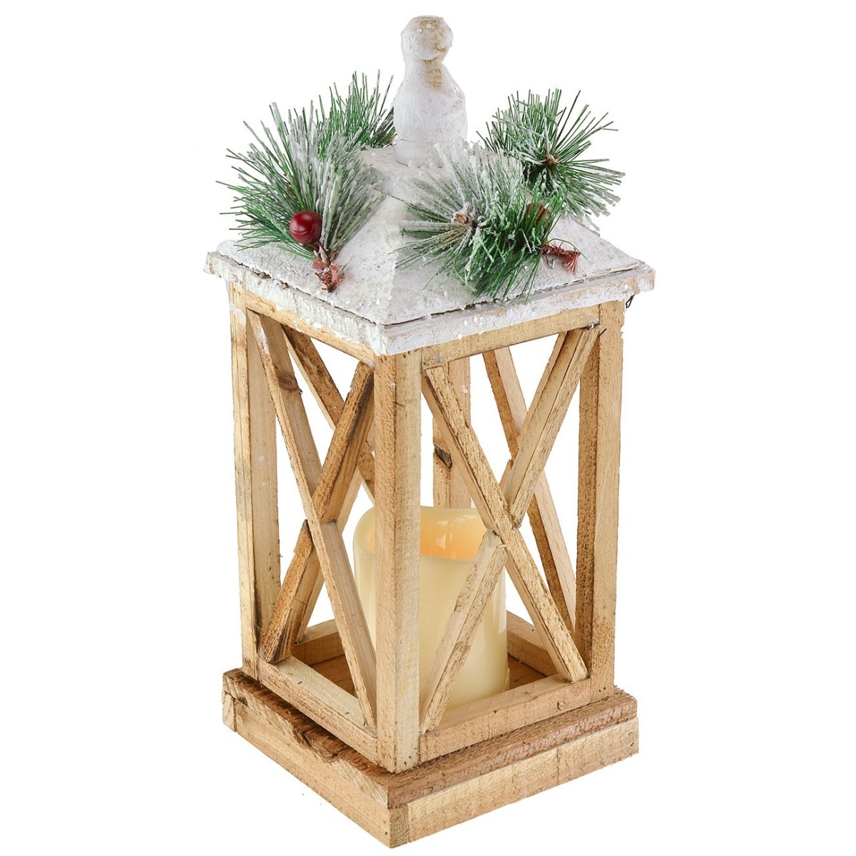Light wooden lantern with snow-covered roof decorated with pine needles and red berries, comes complete with candle illuminated by a flickering light. This furnishing accessory gives warmth to the atmosphere and is suitable for being placed in any environment as it runs on batteries (2xAA not included).