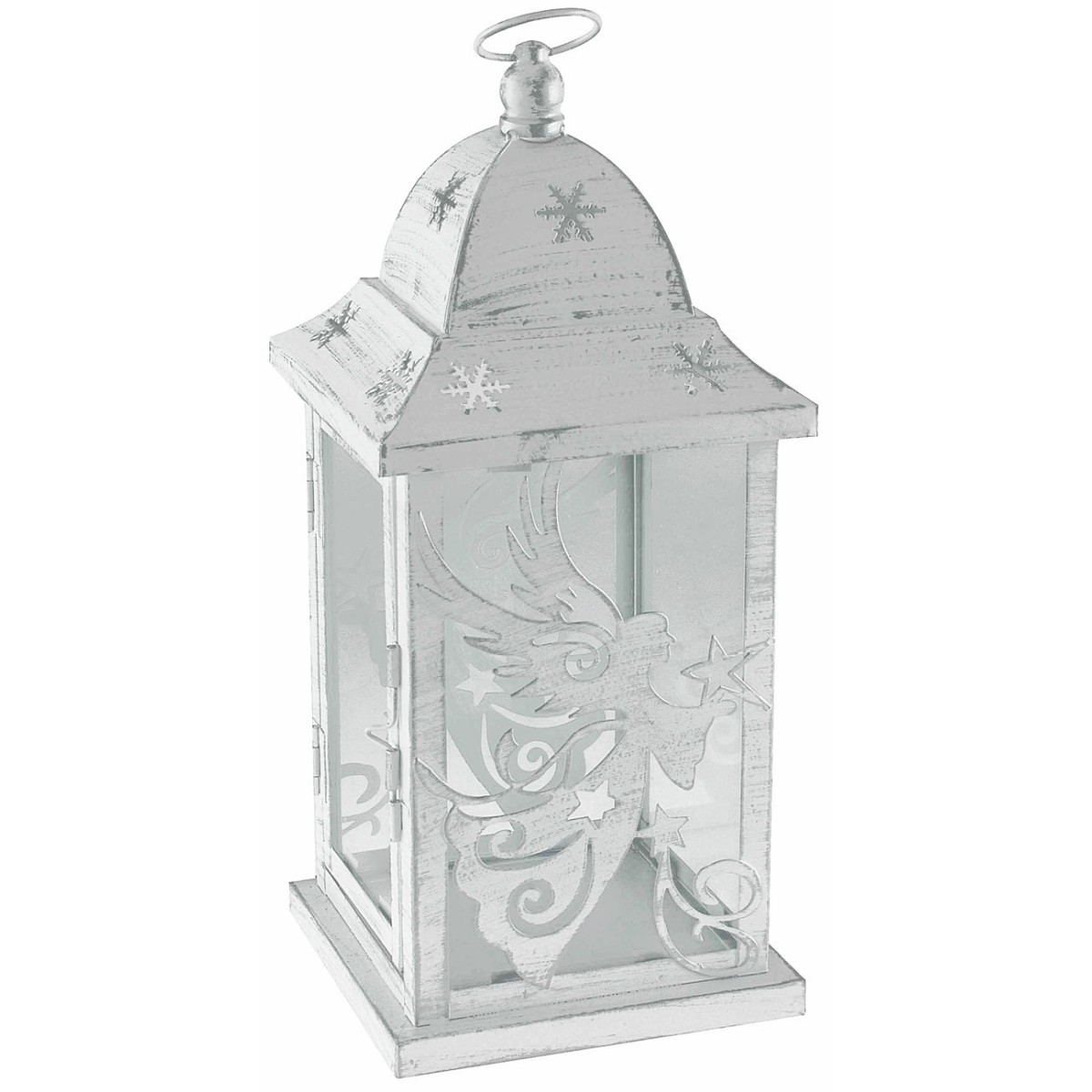 Lanterna chiara in metallo invecchiato con angeli intarsiati su due lati e fiocchi di neve sulla cupola. L'oggetto ha un lato apribile per poter posizionare all'interno lumini o candele. Sul nostro sito sono disponibili varie tipologie articoli adatti all' illuminazione.
