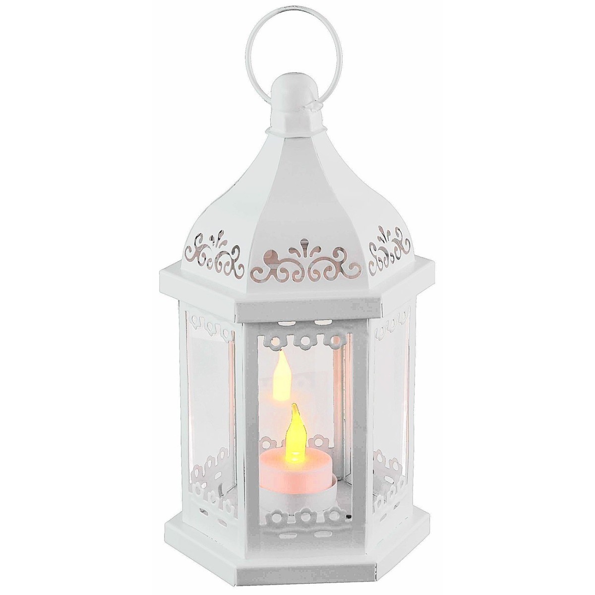 White hexagonal metal lantern with worked dome, the lower part opens allowing you to place tealights or small candles inside. Various types of articles are available on our site to illuminate it.