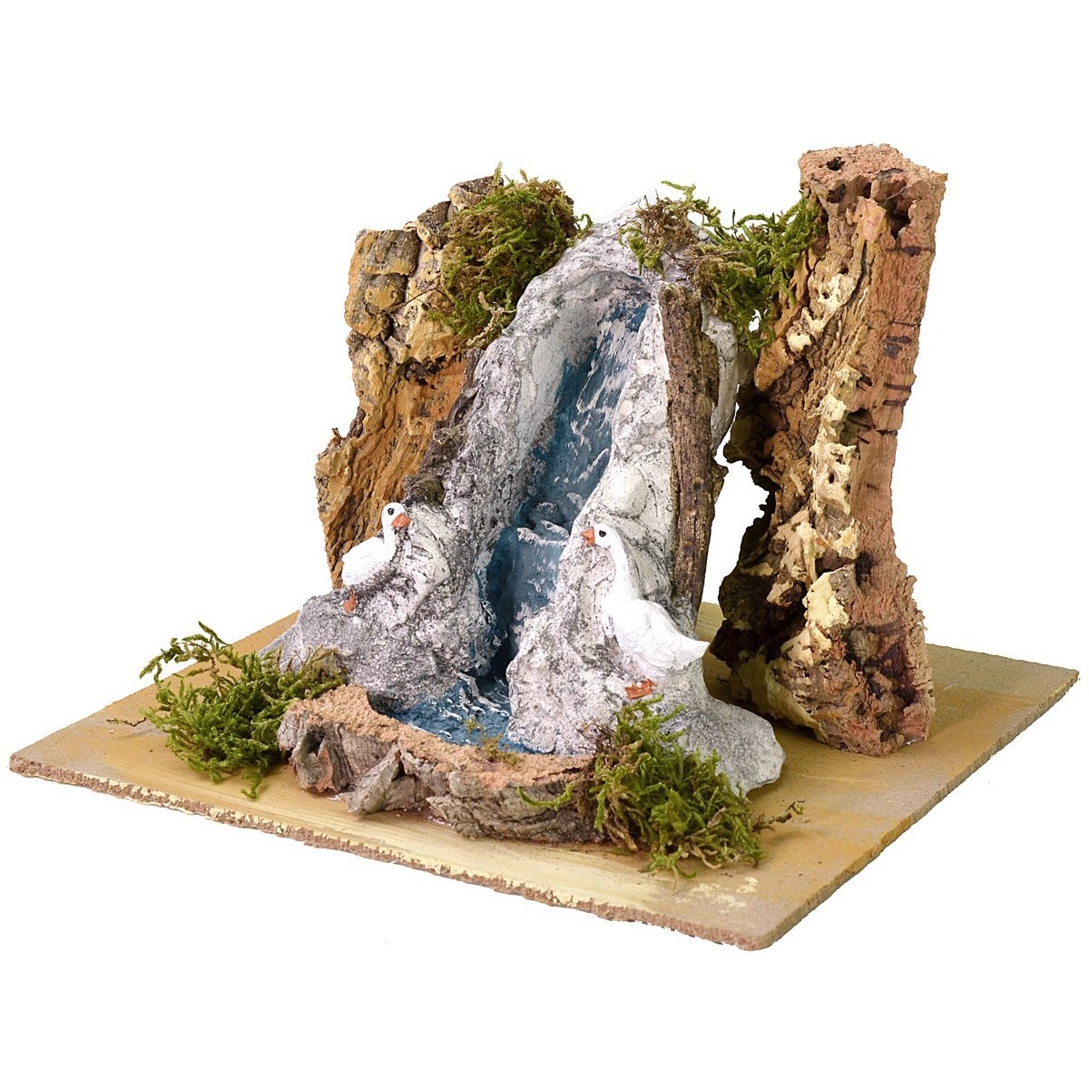 Nativity scene setting that reproduces a waterfall between the rocks with two ducklings. Article produced in Italy with chalk, cork and moss; suitable for statues of 8-10 cm height.