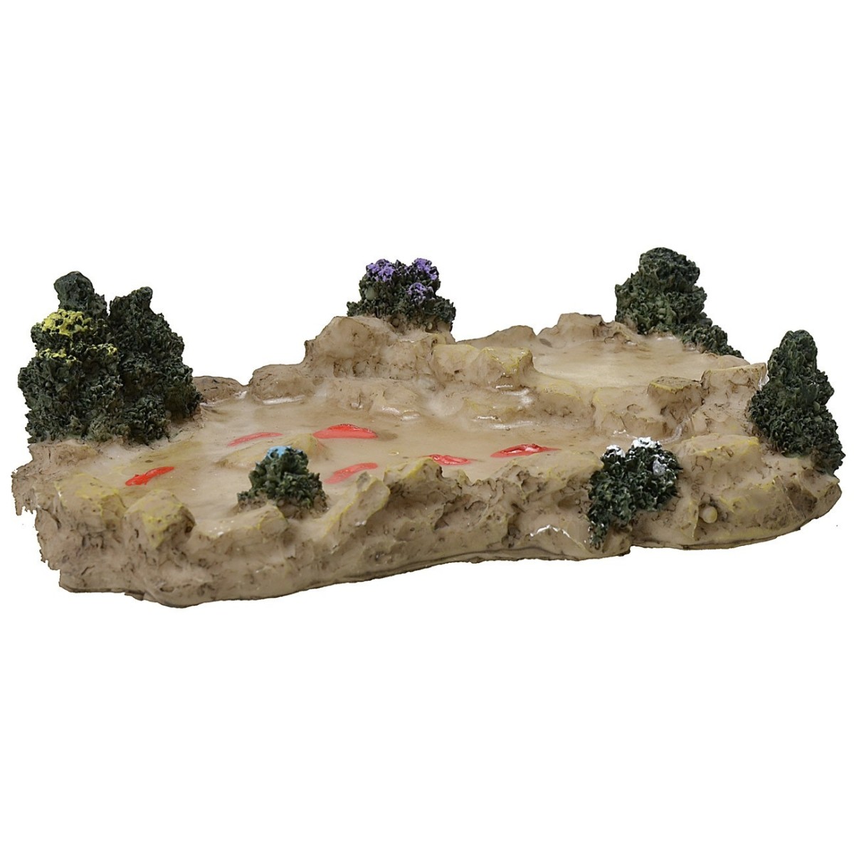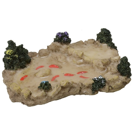 Resin lake with two terraces characterized by white rocks and bushes of green vegetation, many goldfish are visible in the clear water.