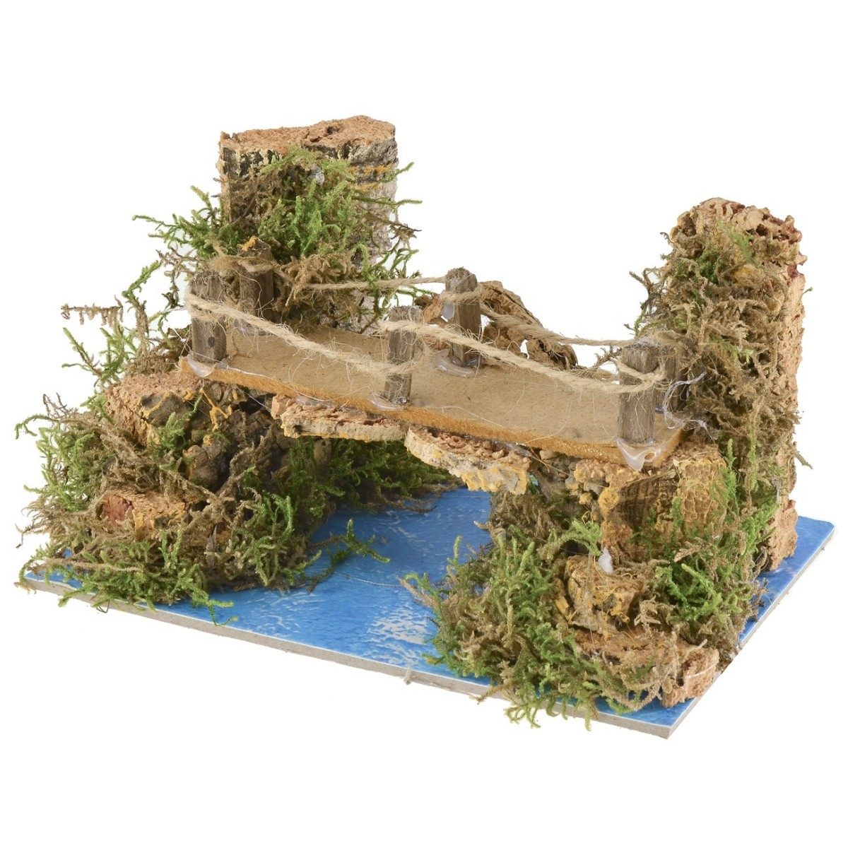 Wooden bridge that connects the two banks of the river that flows below, the walkway is delimited by wooden posts with ropes. The scene is recommended for figurines 6 to 8 cm tall and was made with wood, cork and moss.