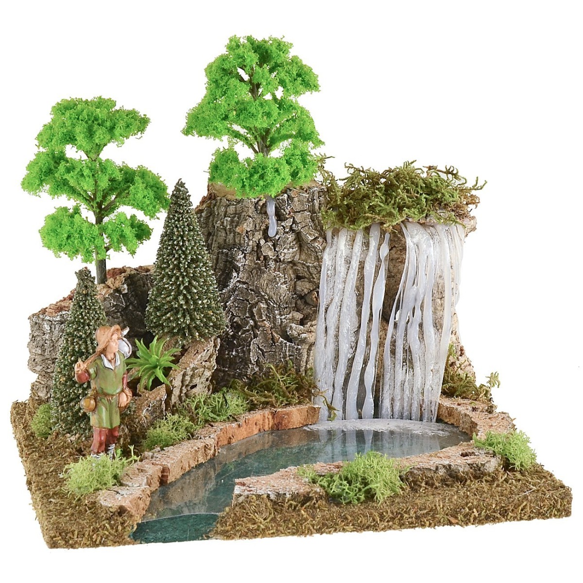 Cascata di montagna con vegetazione che alimenta un lago con effetto profondità. La struttura è adatta a statue di altezza da 8 a 10 cm. Le immagini con le statuine sono solo dimostrative, gli articoli sono disponibili nei prodotti correlati sotto la tabella delle misure. Quest'ambientazione è stata realizzata da sapienti artigiani italiani in legno e sughero.