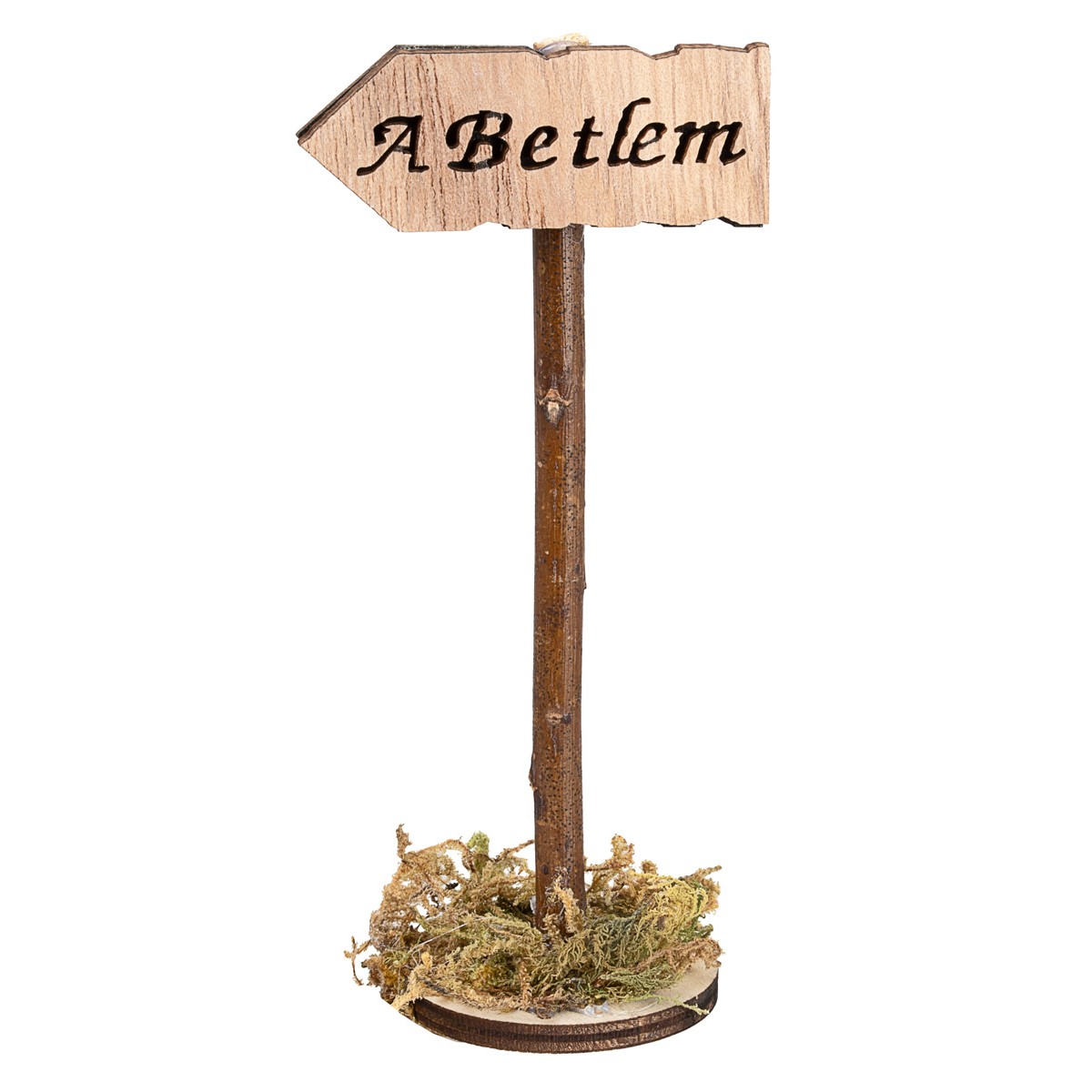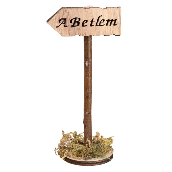 Directional sign with engraved inscription "A Betlem", mounted on a wooden pole with a circular base decorated with moss.