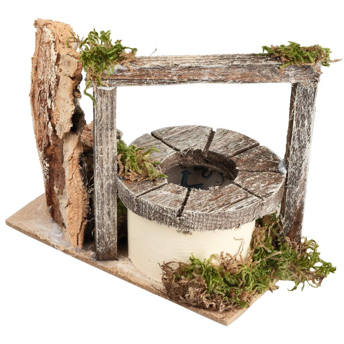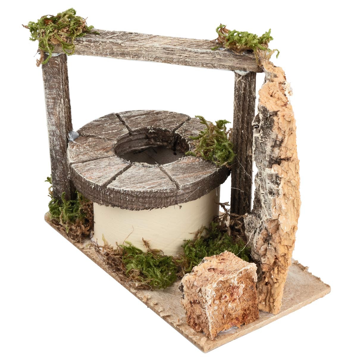 The structure features a cylindrical well with a wooden cover and side wall in bark, decorated with natural moss.