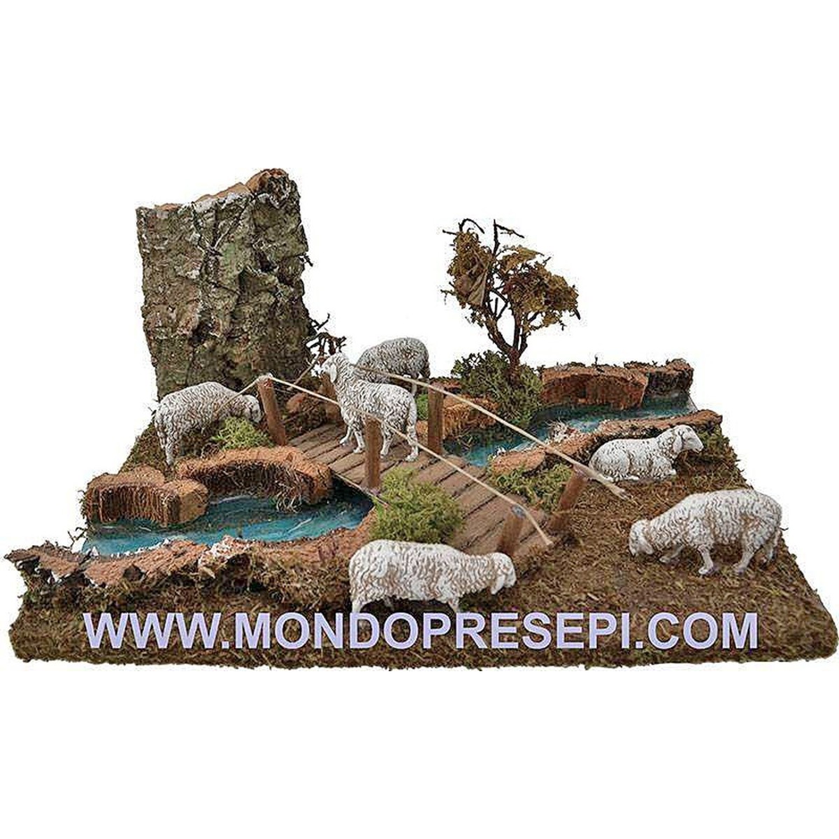 The stretch of the river with wooden bridge. depth effect, with the sheep series Landi for statues 10 cm.