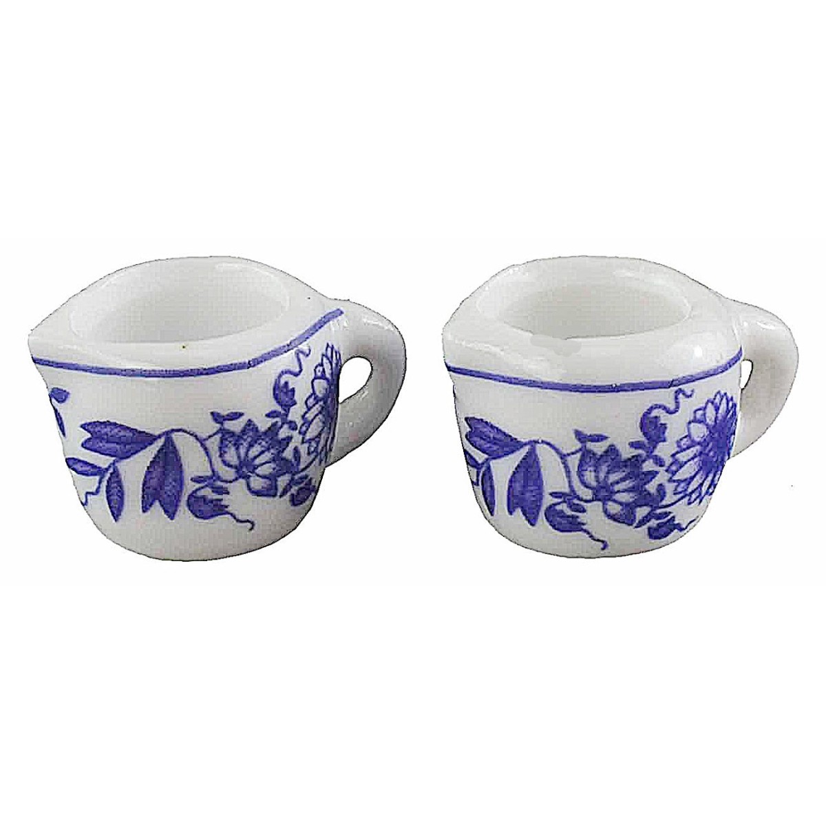 Conjunto de dos recipientes con asa en cerámica blanca y decoraciones azules, recomendado para estatuas de altura de 8 a 10 cm. El artículo puede ser utilizado para completar aparadores en el belén hecho a mano o en casas de muñecas.