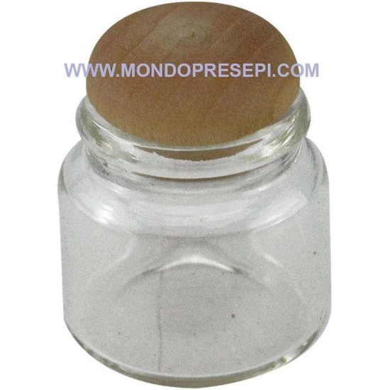 Tarro de vidrio, con tapa de madera abatible.