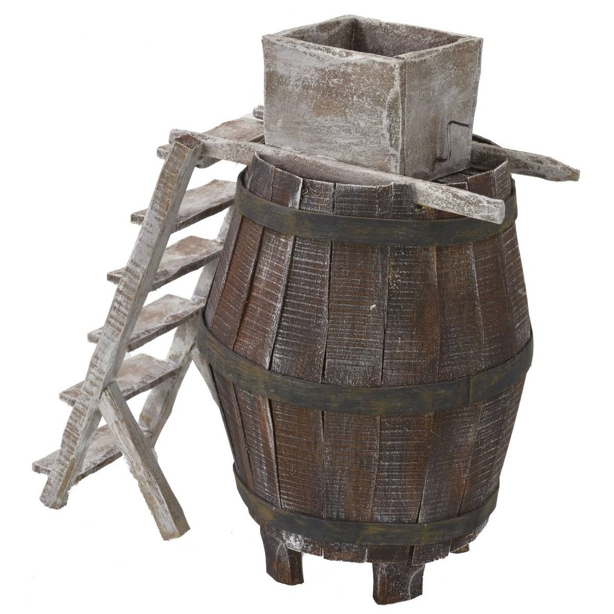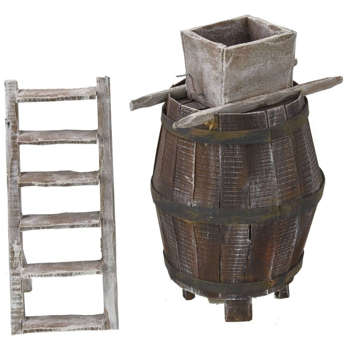 Ambientación para Belén, compuesta por un barril con molino para uva y una escalera para poder alcanzarlo. Fina manufactura con estructura de madera, ideal para enriquecer su Belén de manera única y original. Este artículo ha sido realizado por hábiles artesanos italianos para el Belén clásico popular en madera. Se recomienda combinar el producto con estatuas de 10-12 h cm.