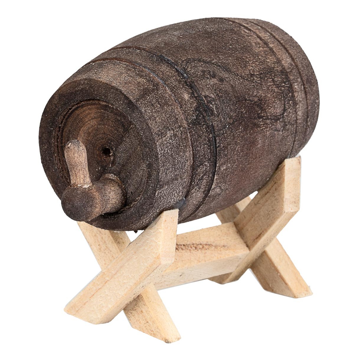 Barril realizado completamente en madera, con grifo moldeado y soporte de caballete que permite su colocación elevada. El diseño sencillo y realista lo hace adecuado para decoraciones campesinas, establos o bodegas en el belén.