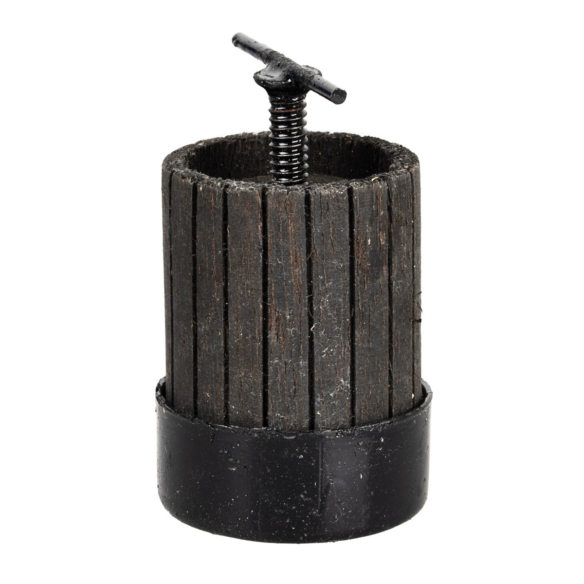 La prensa de madera negra con perilla y base de metal está diseñada para figuritas de 10 cm de altura, lo que la convierte en un complemento ideal para la bodega de un belén.