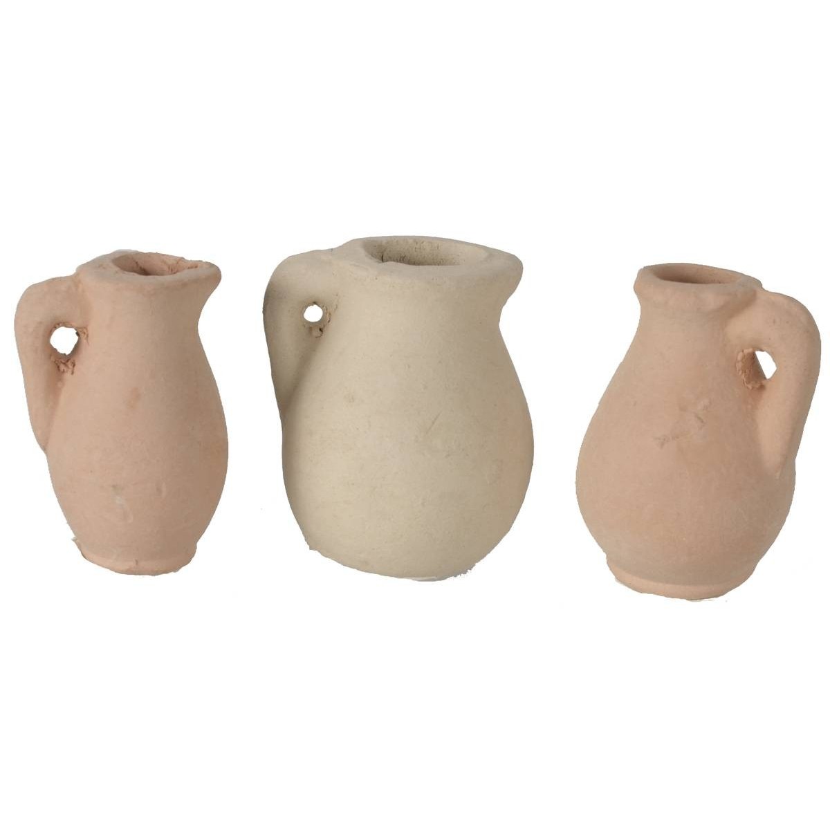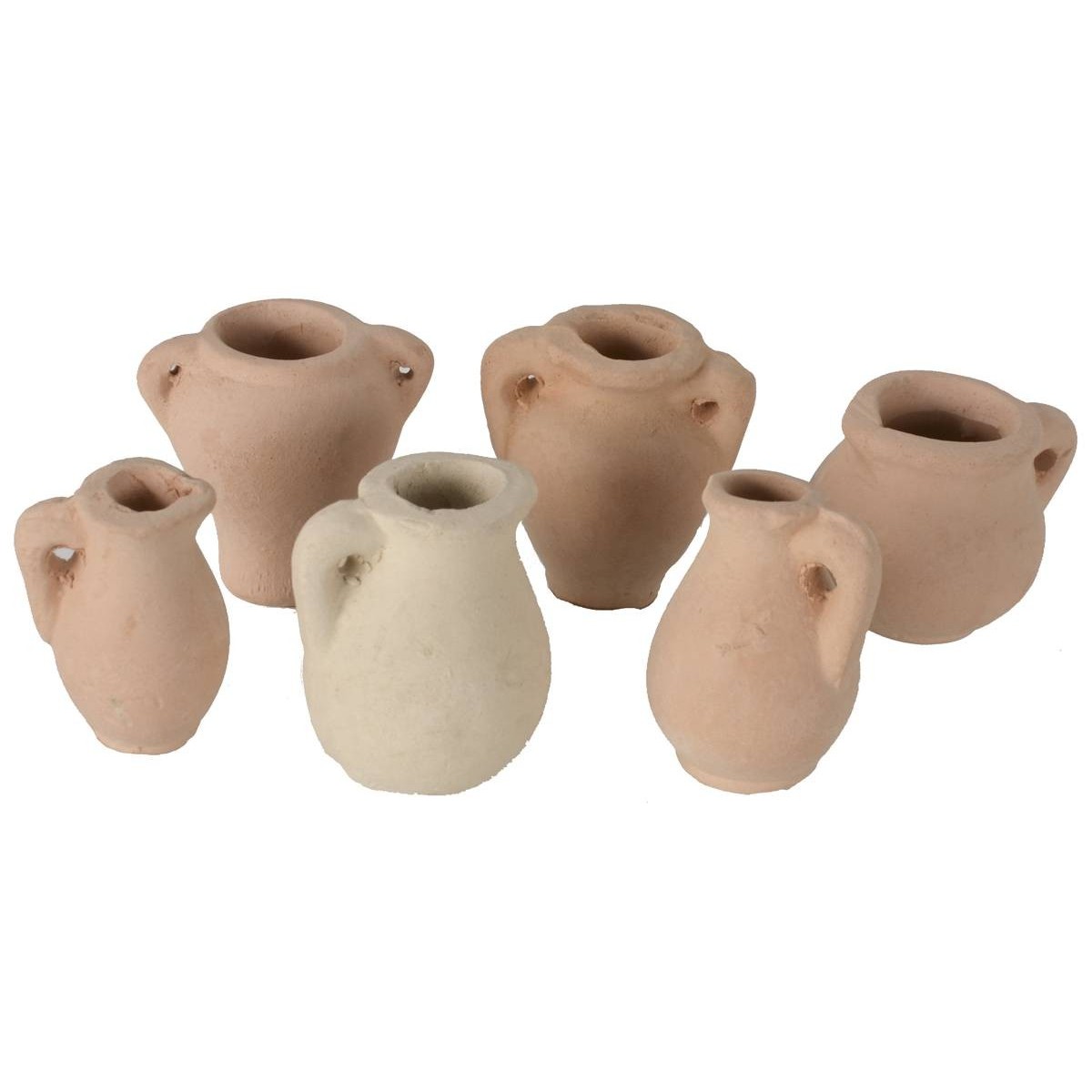 Recomendadas para figuritas de altura de 8-10 cm. Juego compuesto por seis ánforas de terracota de varios tamaños, ideales para enriquecer ambientaciones rústicas, escenas de mercado o detalles de la vida cotidiana en el belén.
