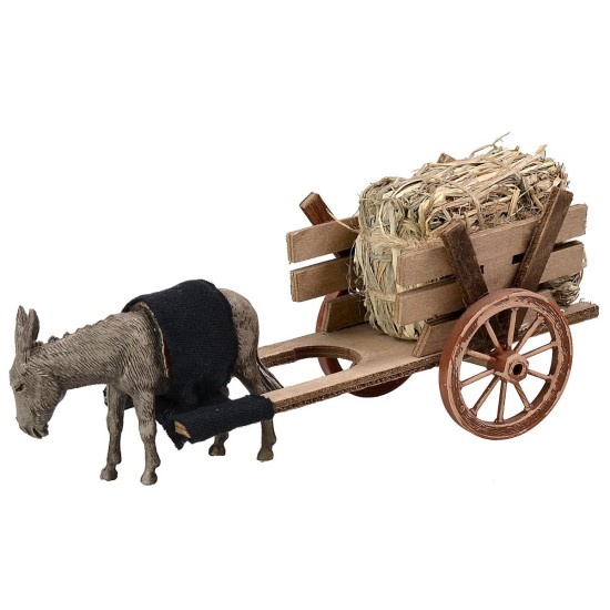 Carreta de madera con heno tirada por un burrito y es perfecta para enriquecer los ambientes de tu Belén hecho a mano. Este artículo es recomendado para estatuas de altura de 10 cm y, como se muestra en las fotos, es posible colocar un carretero al mando disponible en los productos relacionados bajo la tabla.