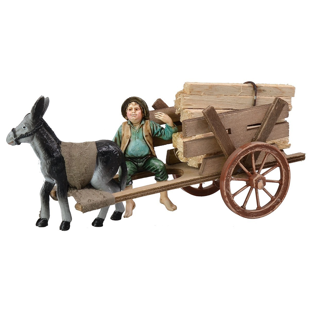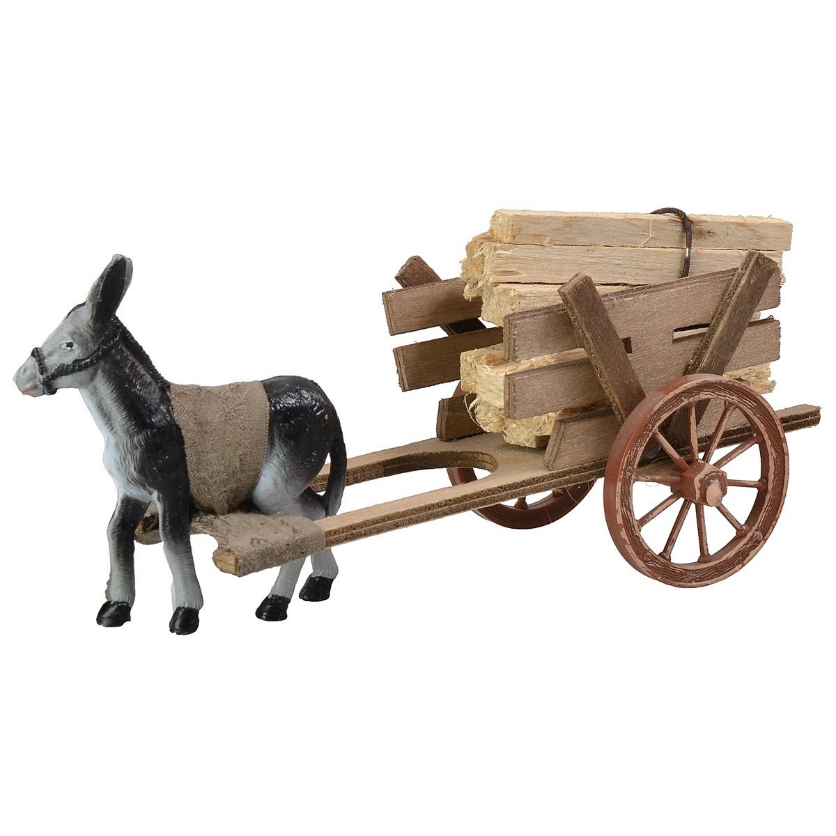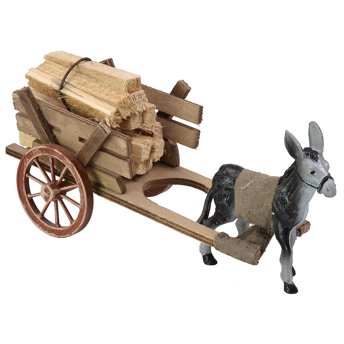 Carreta con leña tirada por un burrito, perfecta para enriquecer los ambientes de tu Belén hecho a mano. Este artículo es recomendado para estatuas de altura de 10 cm y, como se muestra en las fotos, es posible colocar un carretero al mando, disponible en los productos relacionados bajo la tabla.
