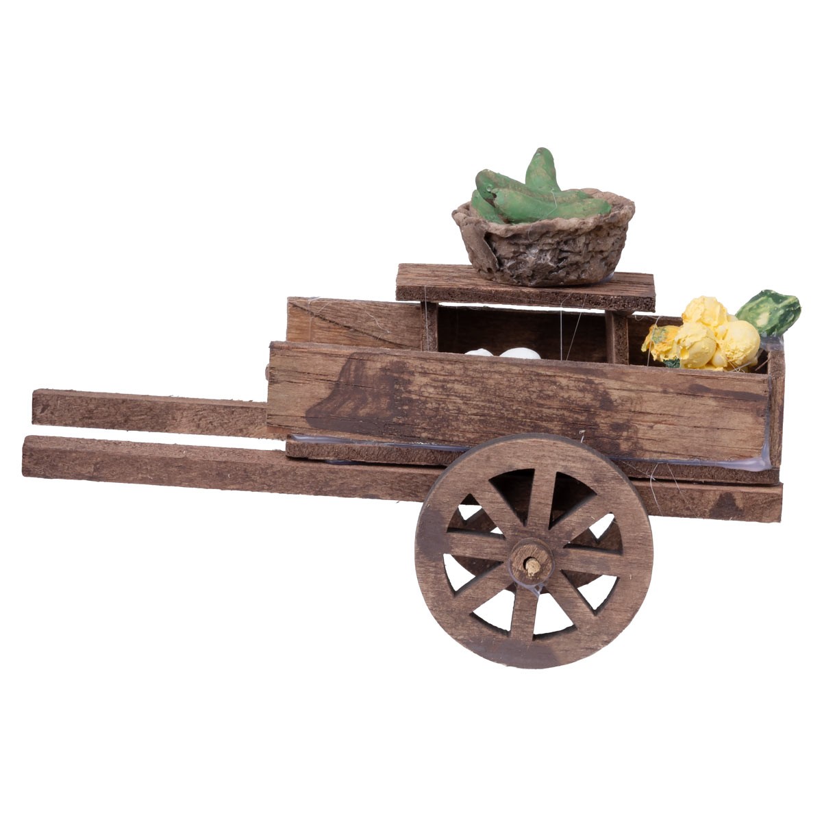 Carro de madera, producido de manera artesanal, adecuado para figuritas de altura entre 10 a 15 cm, transporta una variedad de productos agrícolas incluyendo calabacines, un tronco de limones, cebollas y sopas rojas, todos minuciosamente pintados a mano para un aspecto extremadamente realista. Diseñado y realizado por hábiles artesanos en Italia, cada ejemplar puede presentar ligeras variaciones que garantizan su autenticidad.