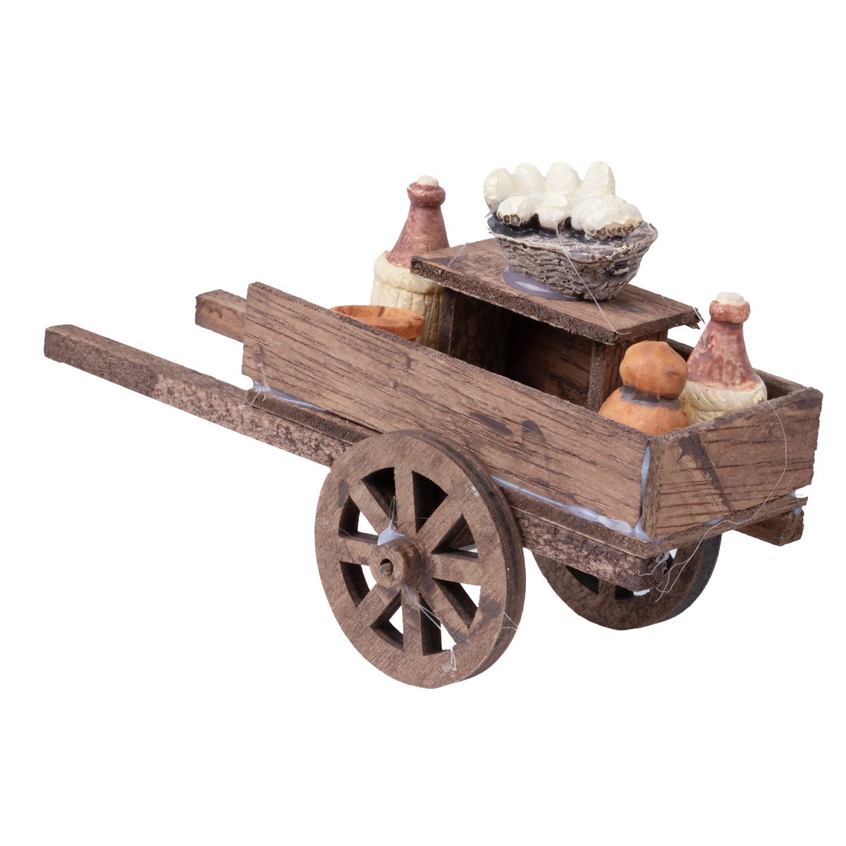Carro de madera que transporta varios productos, incluidas botellas, huevos, queso. La estructura está realizada en madera, encima de ella los productos están pintados a mano y presentan matices muy realistas. Ha sido realizada artesanalmente en Italia, por lo que se precisa que la pieza podría variar ligeramente respecto a la foto.