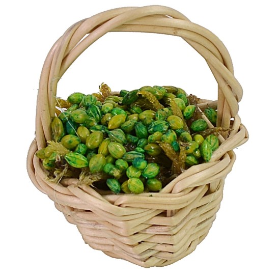 Cesta de mimbre con asa llena de aceitunas, recomendada para estatuas de belén de altura 8-10 cm.