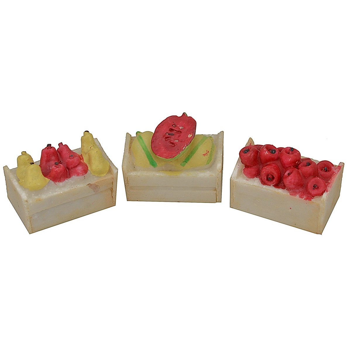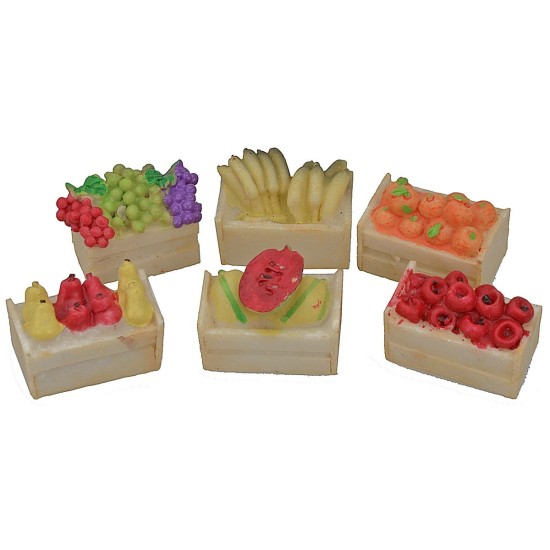 Conjunto compuesto por 6 cajas de resina que contienen frutas: naranjas, uvas, manzanas, peras, plátanos, sandía. Las miniaturas son recomendadas para estatuas de belén de altura 8-10 cm.