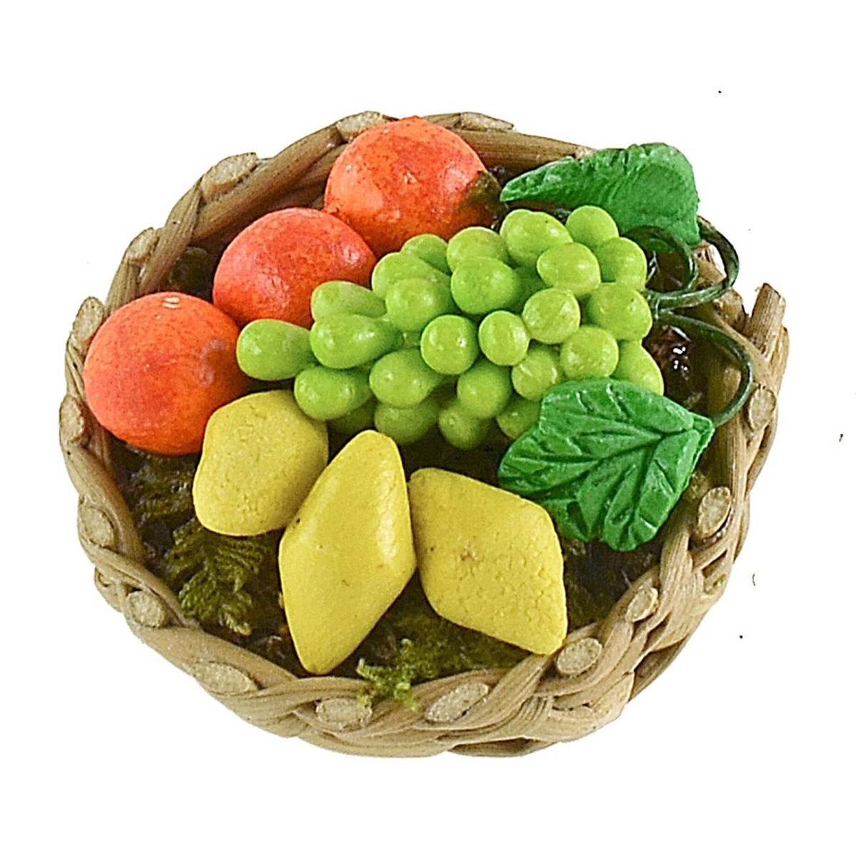 Cesta redonda de mimbre llena de naranjas, peras y uvas blancas. El accesorio en miniatura es útil para decorar el belén hecho a mano y se recomienda para estatuas de altura de 12 a 15 cm.