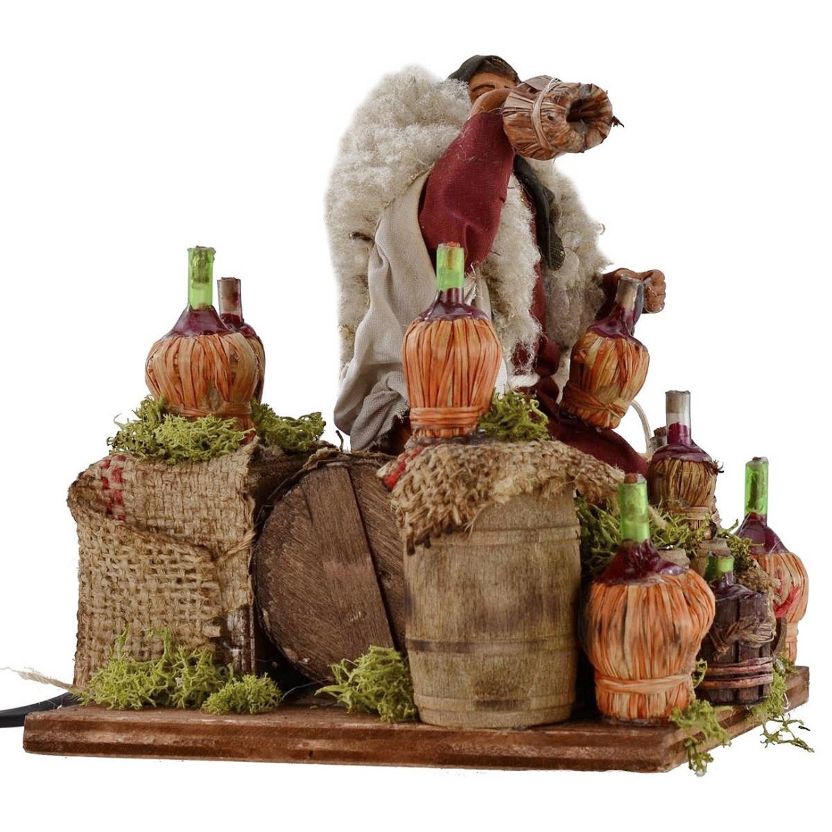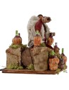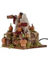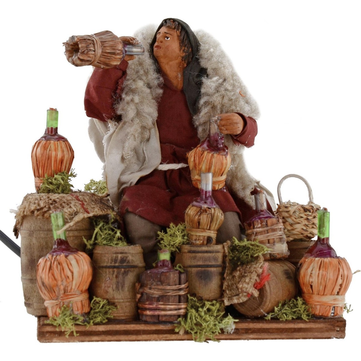 Borracho sentado en movimiento. Gracias al movimiento del brazo, que se mueve hacia arriba y hacia abajo, el borracho simula la acción de beber del frasco que sostiene en la mano. Alrededor se puede notar la presencia de múltiples frascos y barriles. Además, es característica la verde vegetación circundante. La estatua está realizada en terracota y pintada a mano en Italia por hábiles manos artesanas con ropa de tela bien acabada. La estatua para el Pesebre clásico y/o napolitano mide, sentada, 13 cm y se caracteriza por el uso de materiales como la madera, la tela y la terracota. La estatua forma parte de la serie de estatuas de 15 cm. Recordamos, además, que al ser productos realizados artesanalmente, podrían sufrir alguna ligera variación respecto a las imágenes.