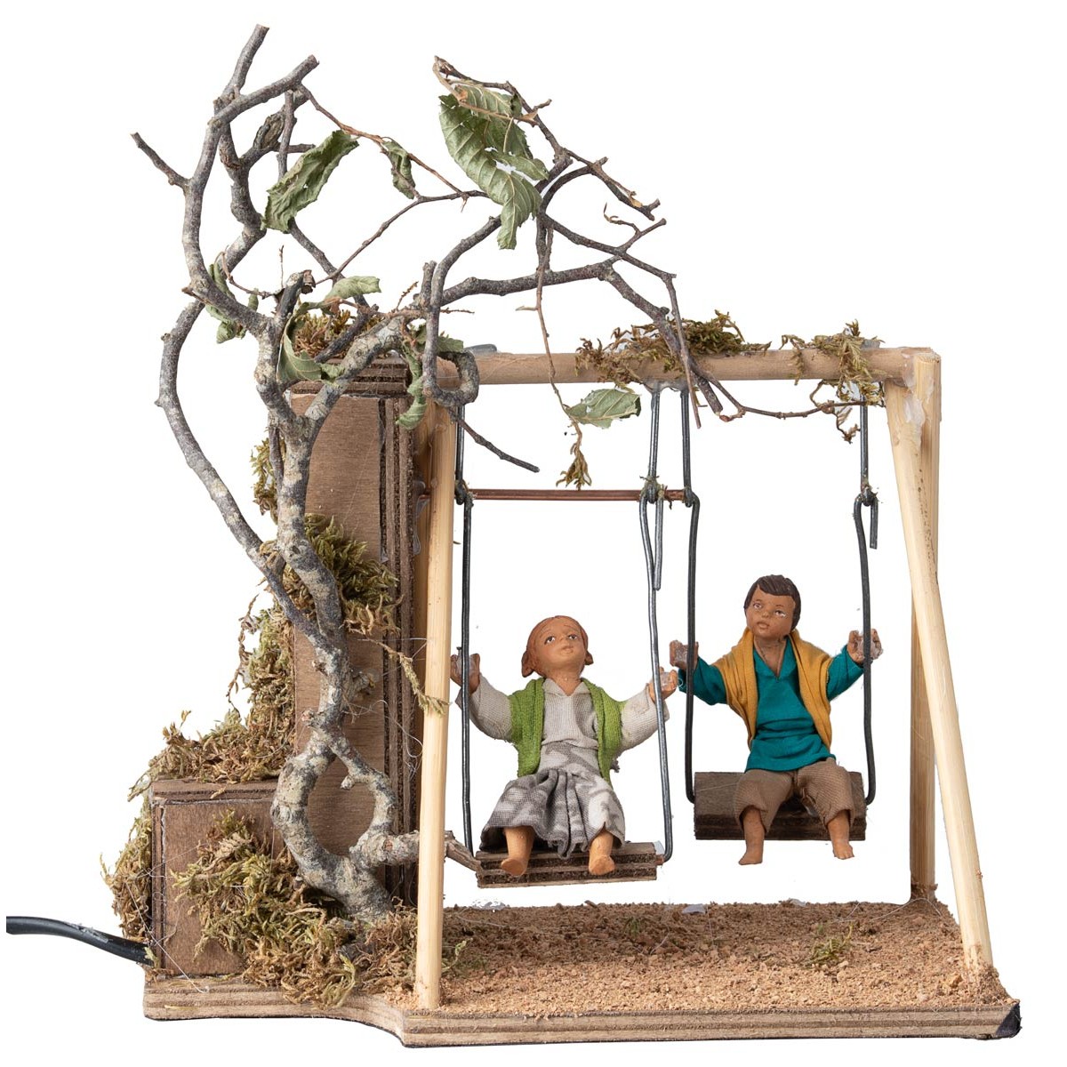 Los niños están en movimiento en el columpio, creando una escena animada y juguetona.