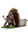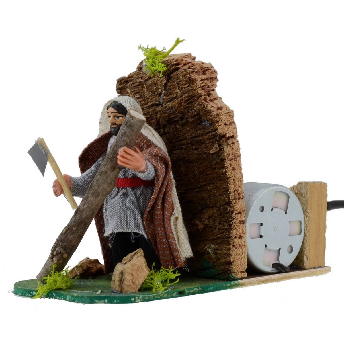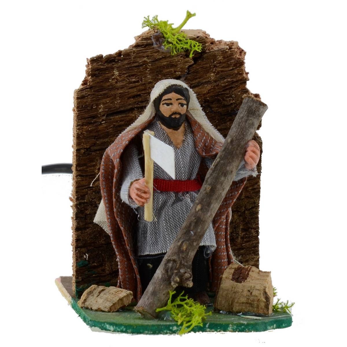 Leñador en movimiento que sostiene el hacha en la mano derecha, levantando y bajando el brazo simula el corte del tronco. Figurilla de terracota, pintada a mano y vestida con tela.