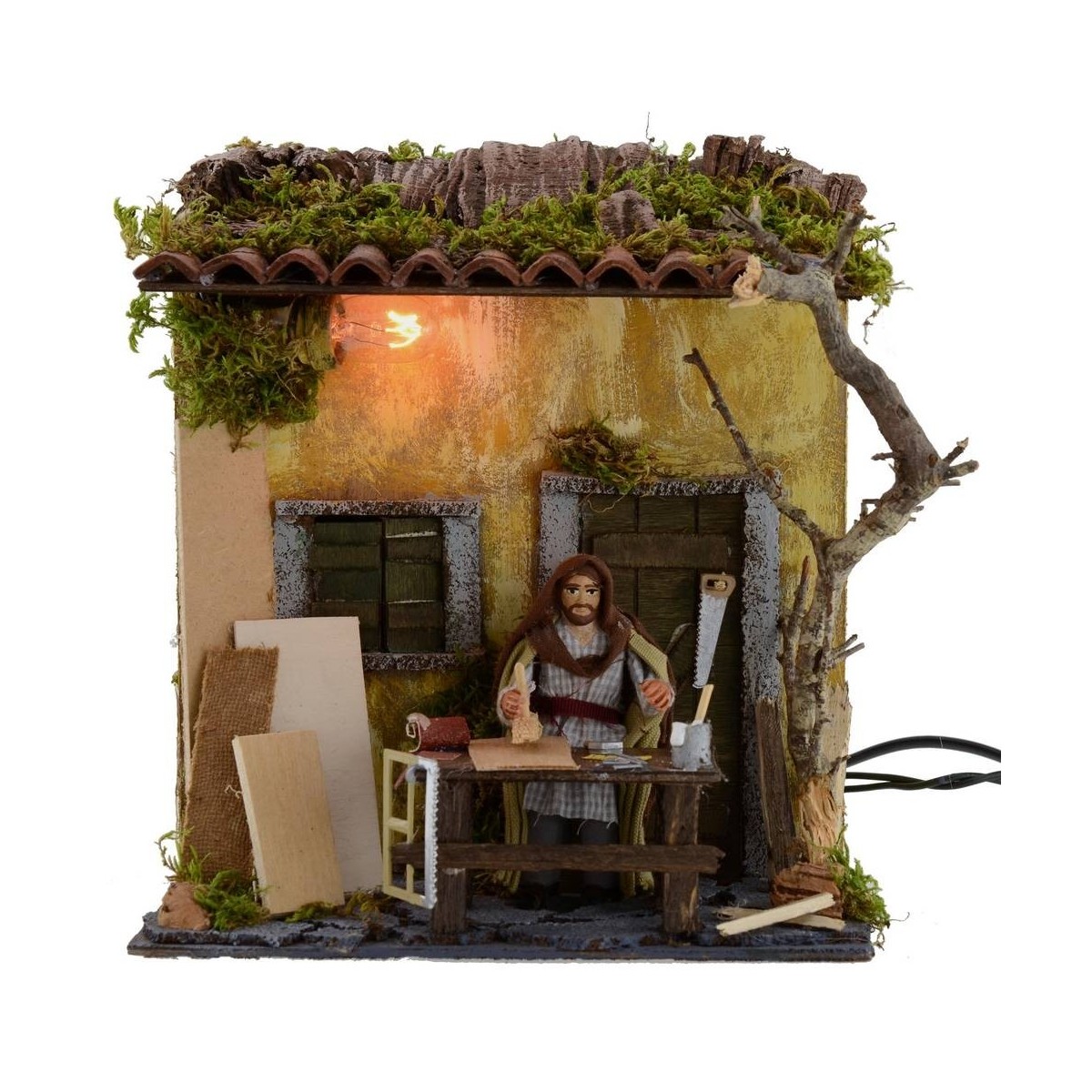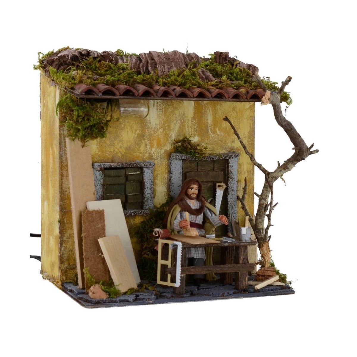 Pastor en movimiento funcionando con corriente con casa iluminada. La estatua es de terracota, vestida con ropa de tela y mueve tanto el torso como el brazo con el que empuña el cepillo. La escena está llena de detalles, decorada con muchas miniaturas como herramientas del oficio, tablones de madera y una planta vieja. La fachada del edificio está iluminada con una luz cálida fija. Esta escena ha sido producida enteramente en Italia por hábiles manos artesanas con terracota, madera y corcho.