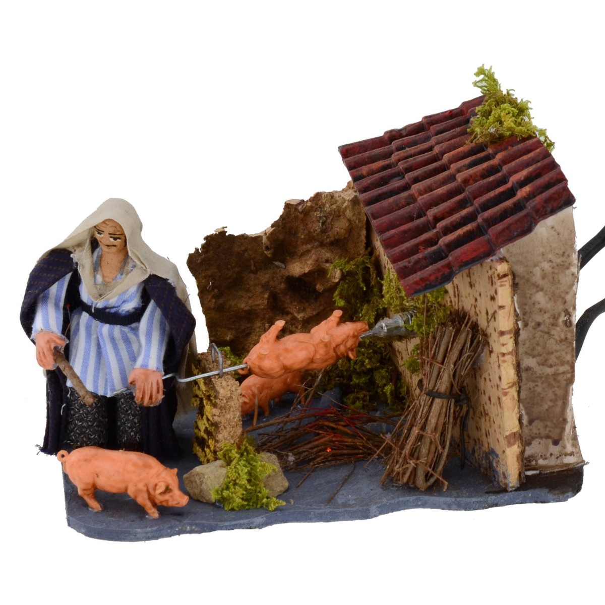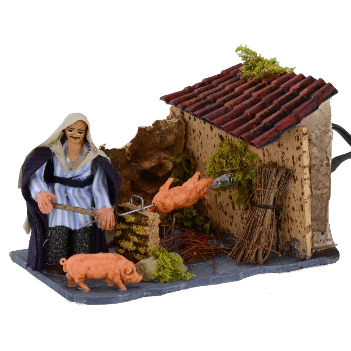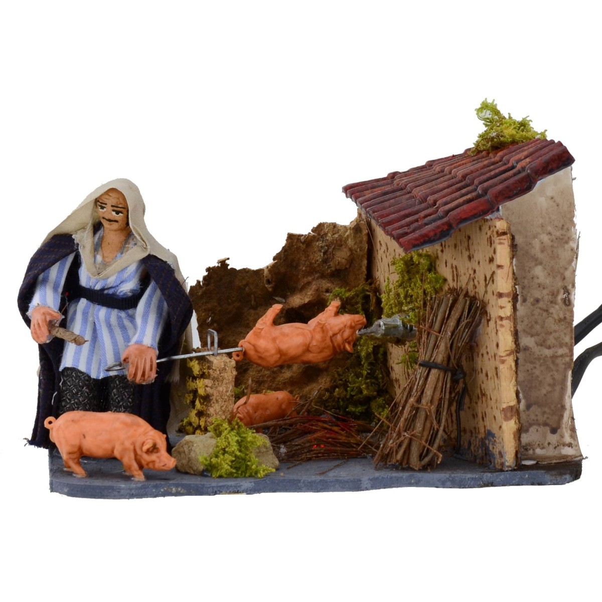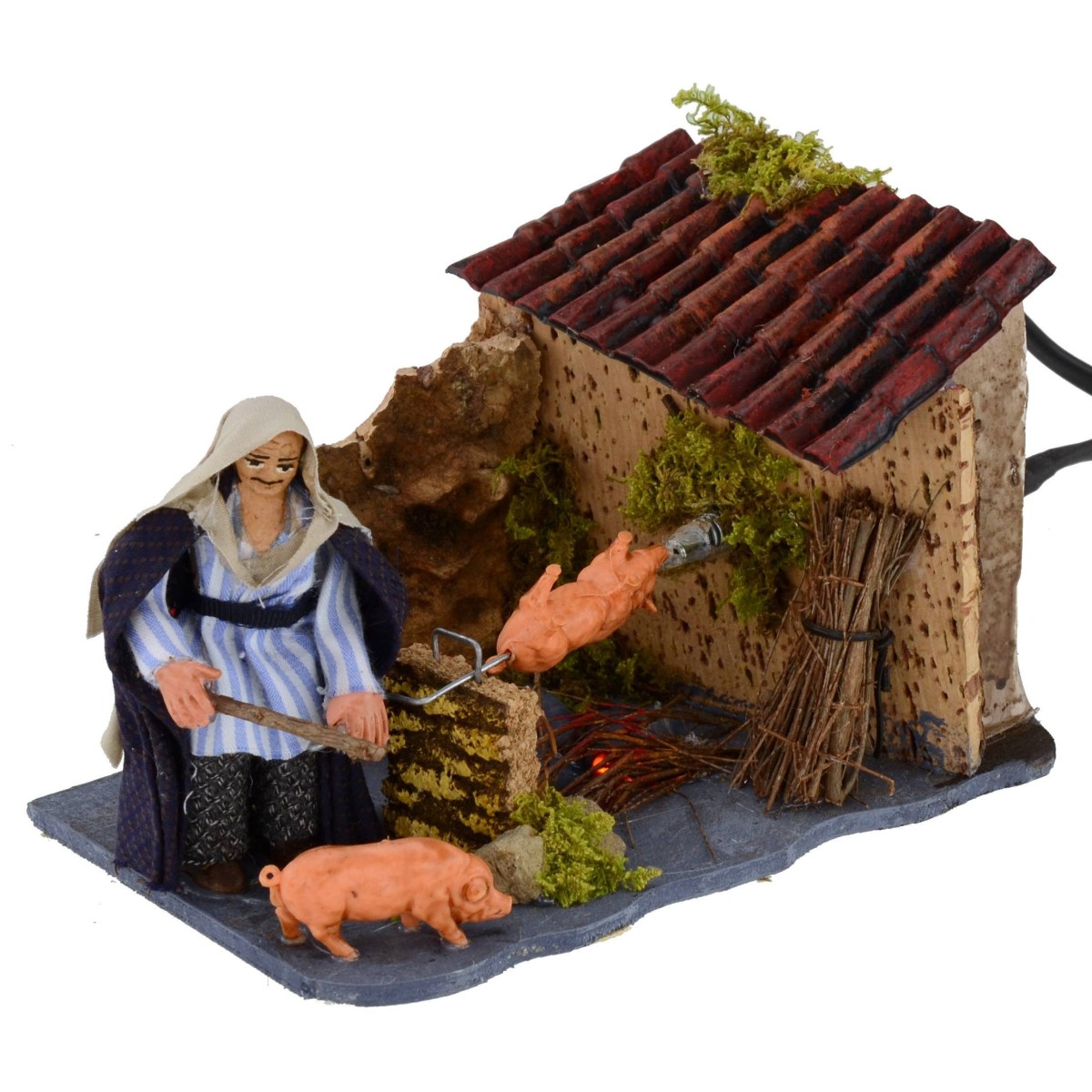 Estatua de terracota que gira el asador de cerdo, debajo del asador hay un fuego iluminado por una luz parpadeante cubierta. Artículo realizado en Italia por manos artesanas expertas, bien acabado con ropa de tela. Figuras adecuadas para el Belén clásico popular de 8 cm de altura.