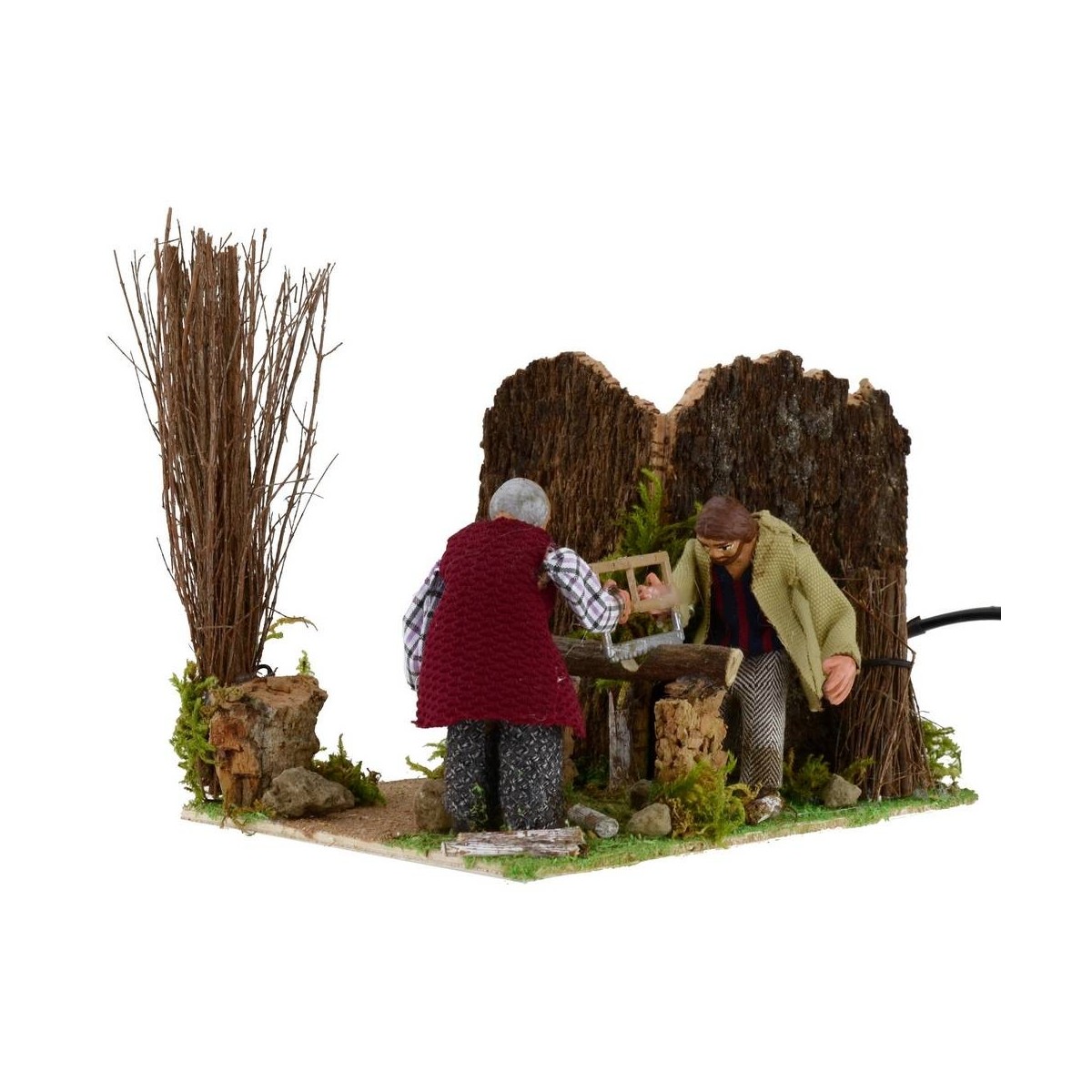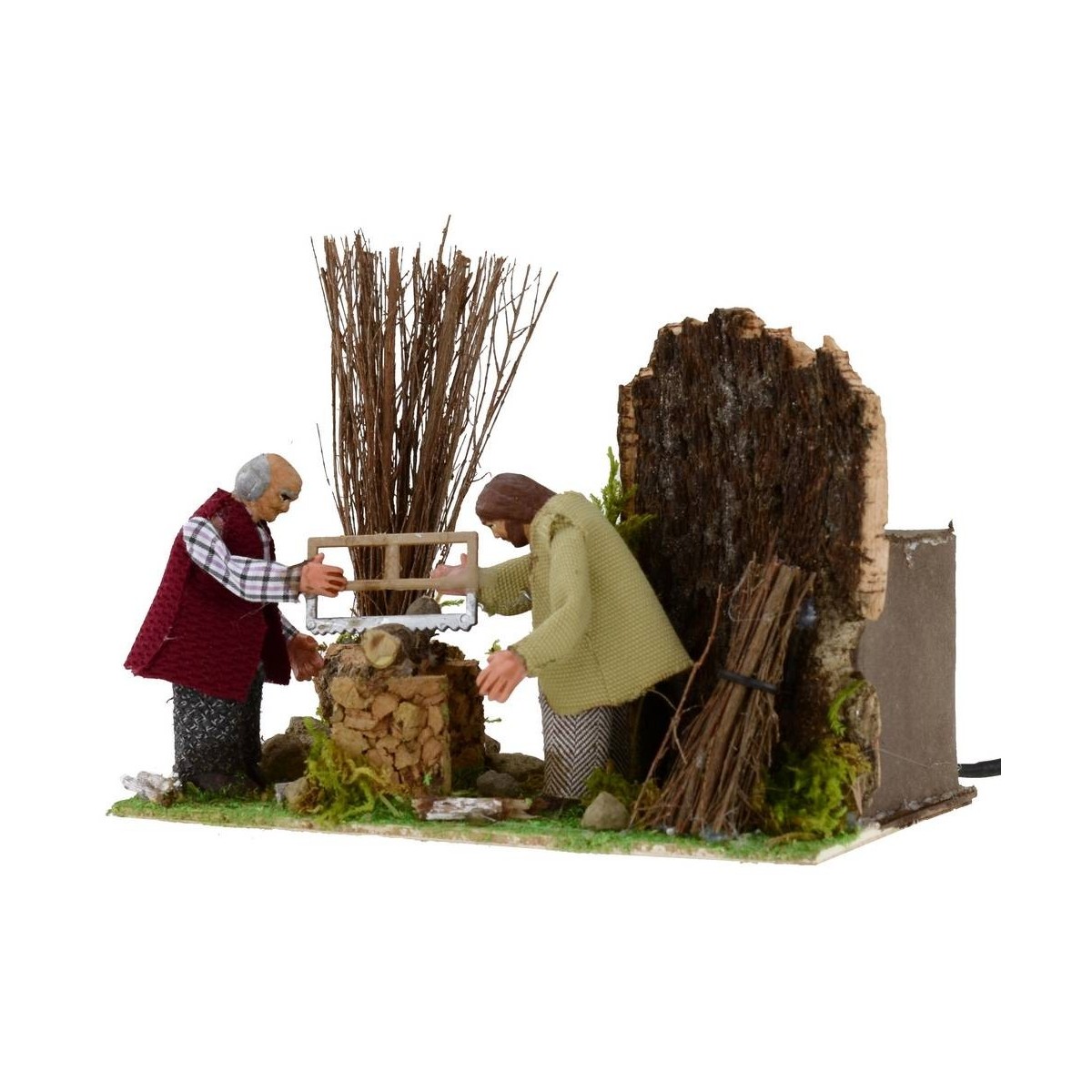 Leñadores de terracota en movimiento que cortan el tronco de madera con la sierra. Escena realizada en Italia por hábiles manos artesanas, bien acabada, estatuas vestidas en tela de altura 8 cm.