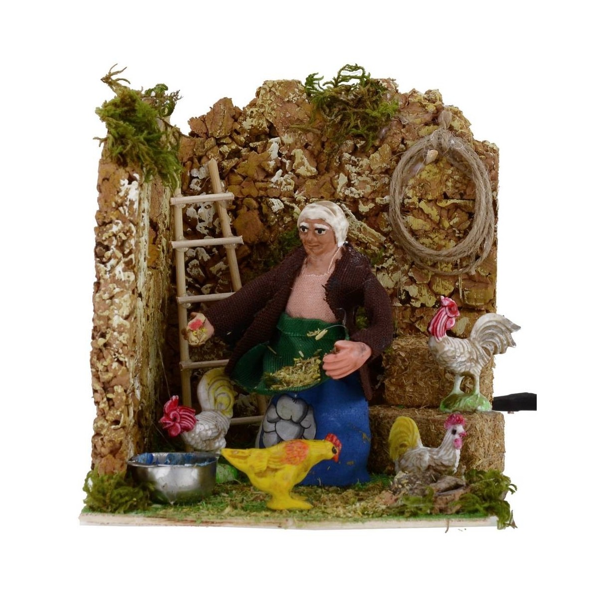 Campesina con gallinas en movimiento, funcionando con corriente. La escena está llena de detalles: en primer plano vemos a la mujer, sentada, alimentando a las gallinas; alrededor del personaje hay múltiples gallinas bien acabadas y detalles de campo cuidados al mínimo detalle. La estatua está realizada en terracota y pintada a mano en Italia por manos artesanas con ropa de tela y está equipada con un enchufe que funciona con corriente. La estatua para el Belén clásico y/o napolitano mide, sentada, 8 cm y se caracteriza por el uso de materiales como la madera, el corcho, la tela y la terracota; forma parte de la serie de estatuas de 8 cm.