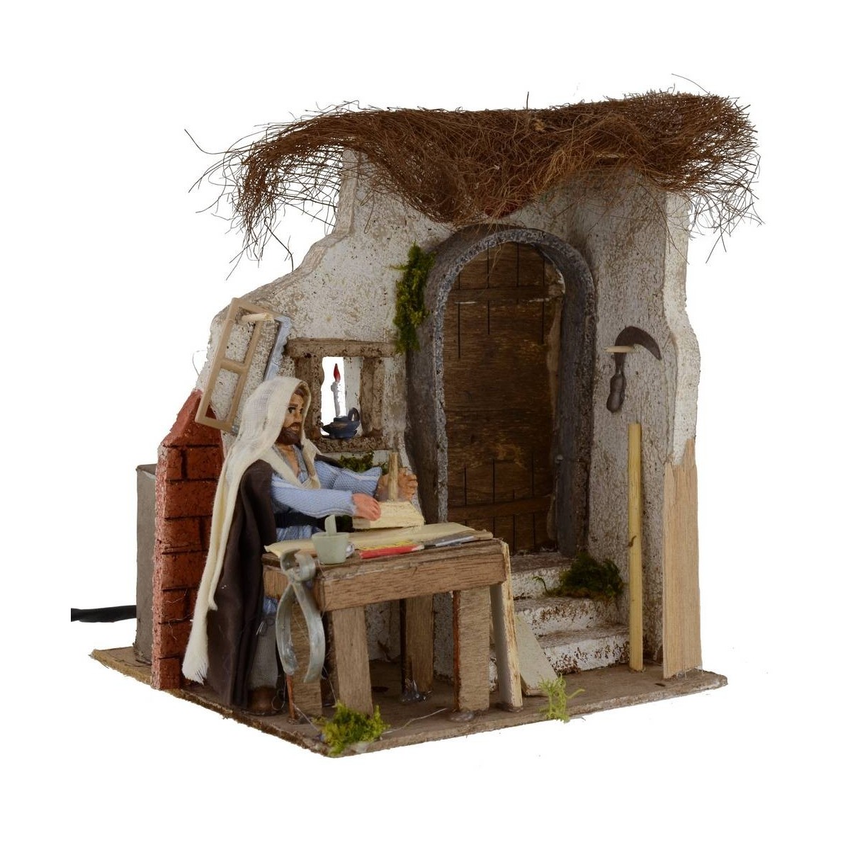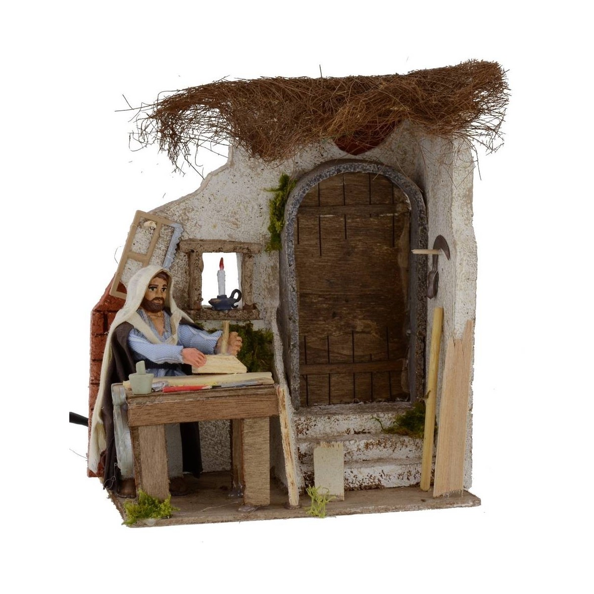Carpintero oriental en movimiento de altura 10 cm. La escena resulta muy rica en detalles: en primer plano vemos al carpintero en un banco mientras lija madera. A su alrededor notamos la presencia de múltiples y variados herramientas de trabajo como una tenaza, una sierra, un martillo, un hacha, un metro, un lápiz y varias tablas de madera. A la derecha, hay unos escalones que permiten el acceso al taller árabe caracterizado por una imponente entrada con arco y puerta de madera. En la pared del taller hay una ventanita abierta donde se apoya una lámpara con portavelas. Completa la escenografía un cobertizo. La estatua está realizada en terracota, pintada a mano en Italia por manos artesanas expertas y vestida con ropa de tela. La estatua para el Belén palestino y/o napolitano tiene una altura de 10 cm y se caracteriza por el uso de materiales como la madera, el poliestireno, el metal, la tela y la terracota.