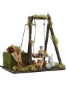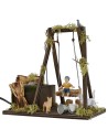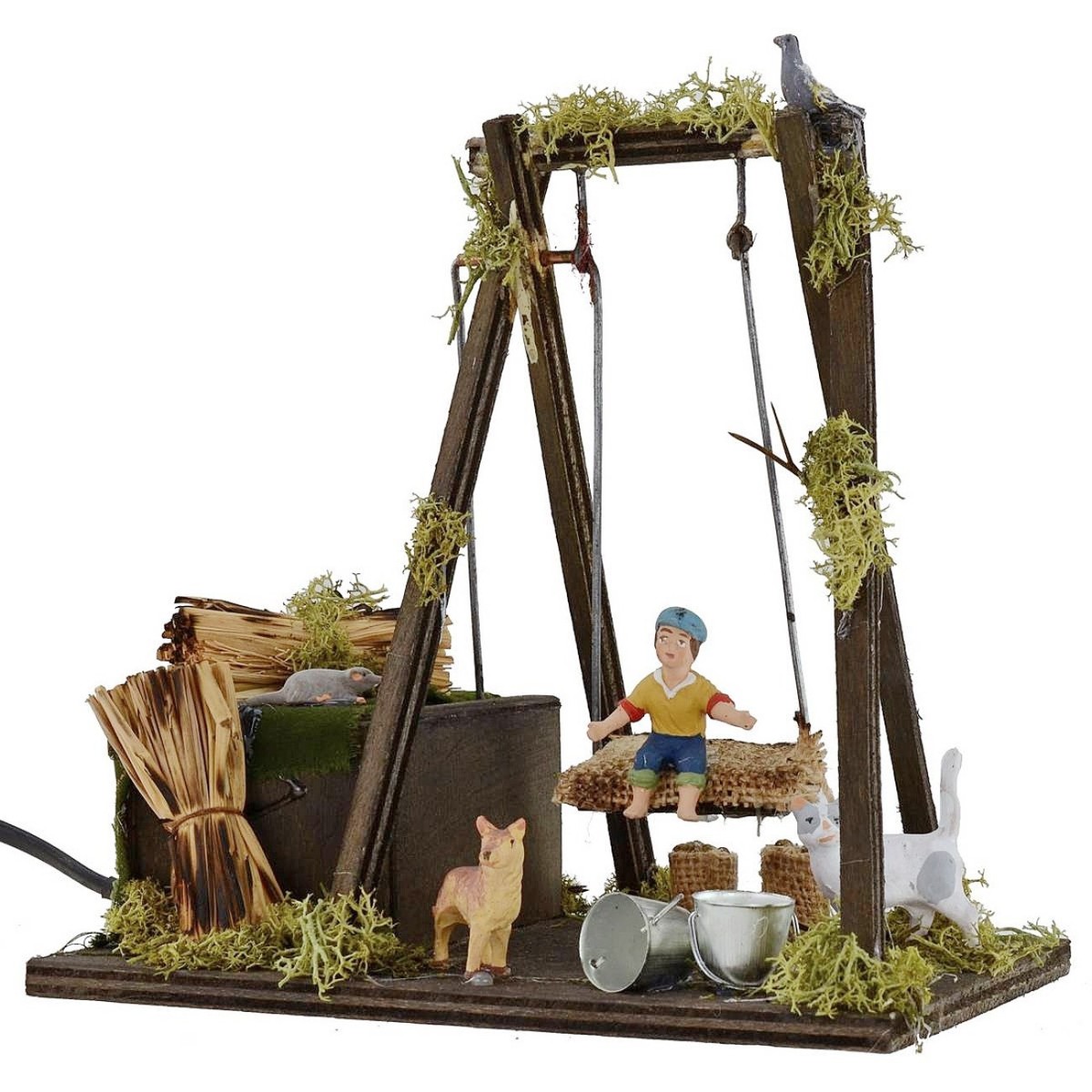 Niño en columpio en movimiento, de la serie de 10 cm. La escena es muy rica en detalles: en primer plano vemos al niño sentado en el columpio que se balancea hacia adelante y hacia atrás, simulando el efecto del columpio, gracias a la unión de este último a un motorreductor. Alrededor, en el suelo, notamos la presencia de múltiples cubos y haces de paja. Otro elemento característico de la escena es la verde vegetación circundante. Acompañan también el perro, el gato, un ratón y una paloma. La estatua está realizada en terracota y pintada a mano en Italia por hábiles manos artesanas. La estatua para el Belén clásico y/o napolitano, sentada, mide 5 cm y se caracteriza por el uso de materiales como la madera y la terracota; forma parte de la serie de estatuas de 10 cm.