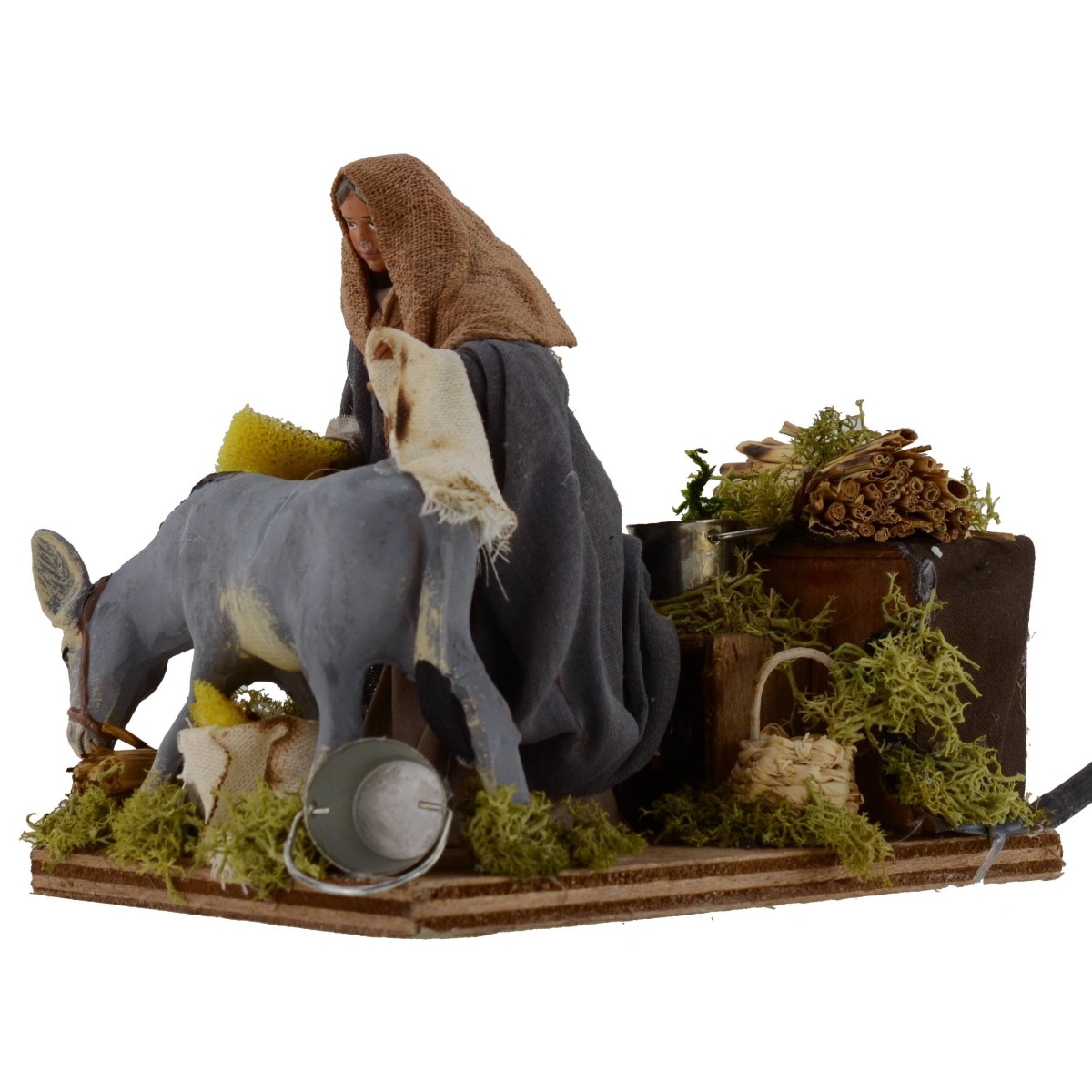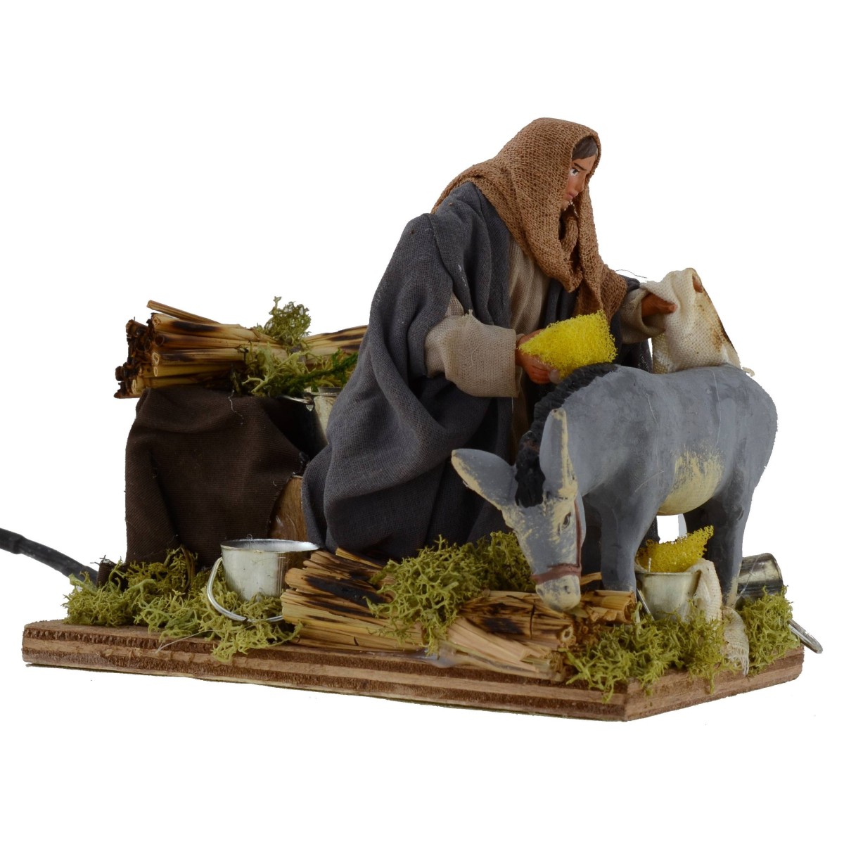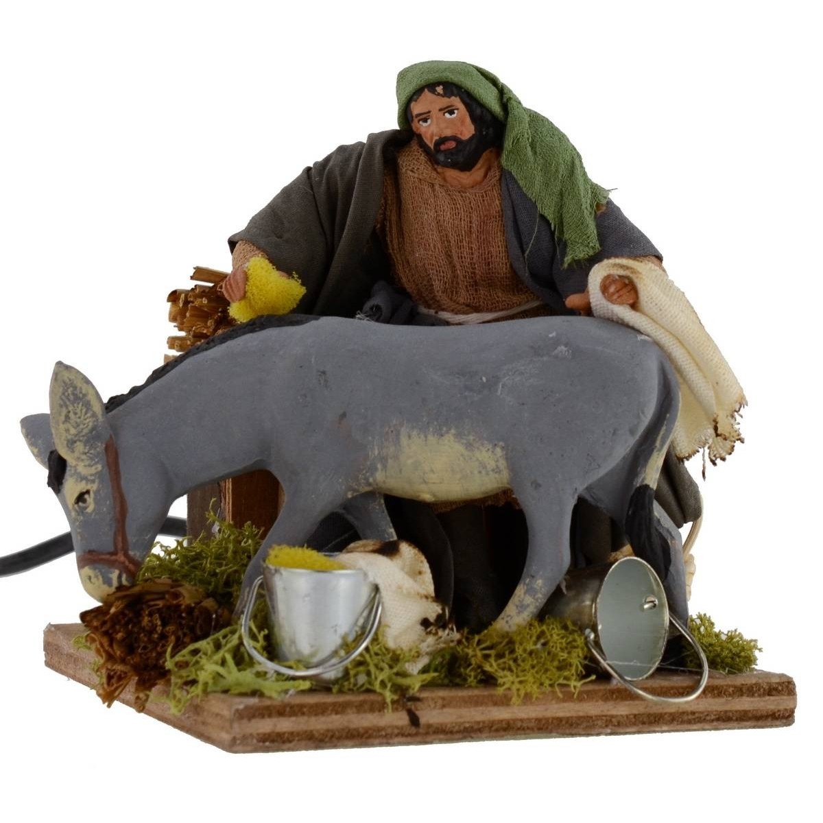Hombre que cepilla burro en movimiento. La escena resulta muy rica en detalles: en primer plano vemos el burro muy bien acabado en los detalles, que está siendo cepillado por el hombre, que, gracias al movimiento del brazo, simula la acción de lavar el burro con una esponja. Alrededor, colocados en el suelo, notamos la presencia de múltiples cubos con esponjas y tela, utilizada para secar, y varios fajos de paja. Otros elementos característicos de la escena son la verde vegetación circundante. La estatua está realizada en terracota y pintada a mano en Italia por hábiles manos artesanas con ropas de tela bien acabadas. La estatua para el Belén clásico y/o napolitano mide 11 cm y se caracteriza por el uso de materiales como la madera, la tela y la terracota; forma parte de la serie de estatuas de 12 cm. Recordamos, además, que al ser productos realizados artesanalmente, podrían sufrir alguna ligera variación respecto a las imágenes.