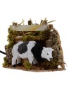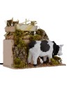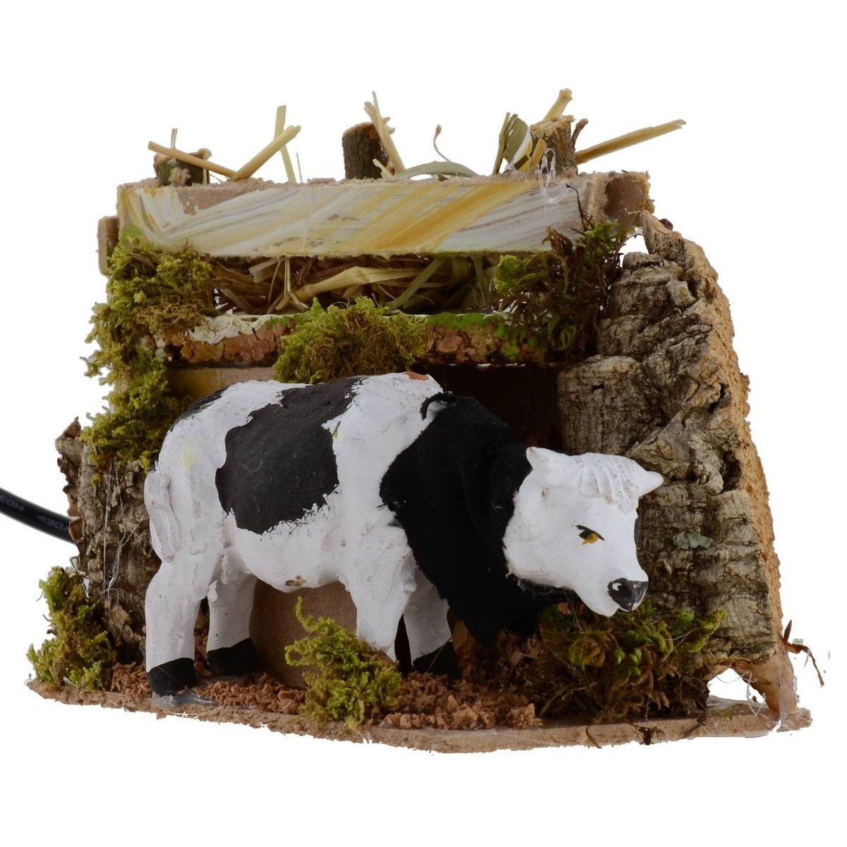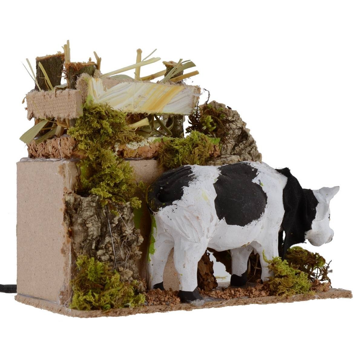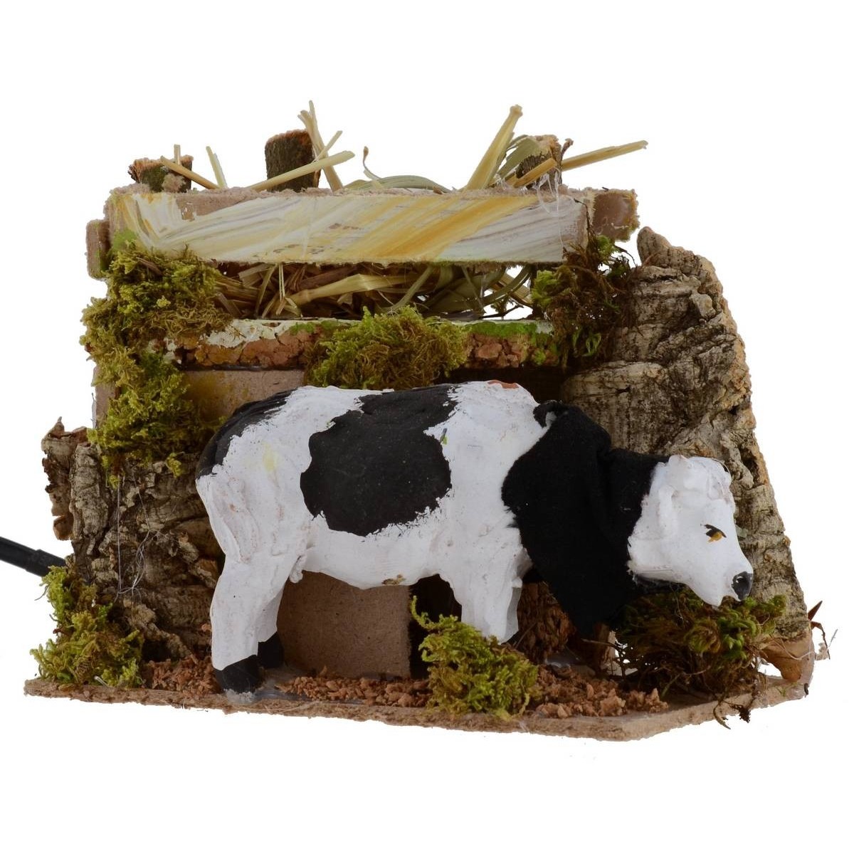 Bue que come en movimiento. Gracias al movimiento de la cabeza, que se mueve hacia la derecha e izquierda, la vaca simula la acción de comer de un arbusto colocado frente a ella. Alrededor es posible notar la presencia de múltiples elementos naturales y la verde vegetación circundante. El buey es de terracota y pintado a mano en Italia por hábiles manos artesanas, está realizado con materiales como la madera, el corcho y la terracota. La ambientación se recomienda para estatuas de altura de 10-12 cm.