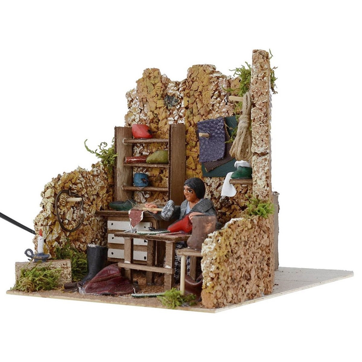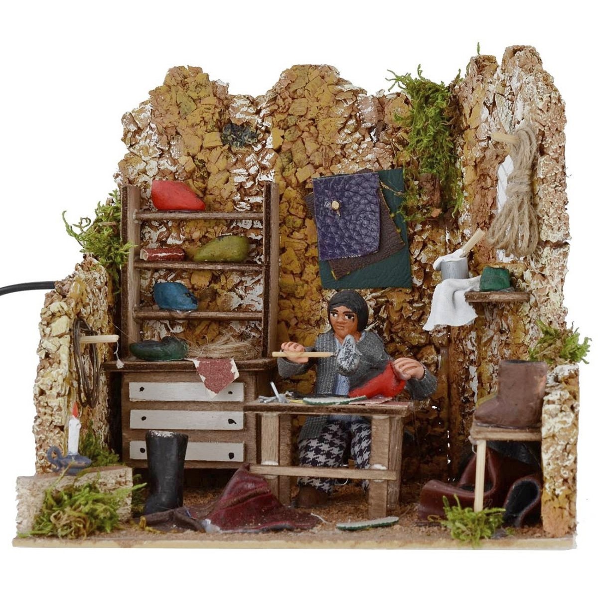 Zapatero en movimiento funcionando con corriente. La escena está llena de detalles: en primer plano vemos al hombre, sentado, dedicado a trabajar en un zapato sobre un banco de trabajo y, gracias al movimiento del brazo que se mueve hacia arriba y hacia abajo, simula precisamente la acción de golpear con un martillo en la suela del zapato. Otros elementos característicos de la escena son las múltiples piezas pequeñas expuestas en el aparador, en el banco de trabajo, en los estantes y colocadas en el suelo, que hacen que la escenografía sea muy sugerente y realista. La escenografía está delineada por tres paredes de corcho con efecto de piedra. La estatua está realizada en terracota y pintada a mano en Italia por manos artesanas con ropa de tela. La estatua para el Belén clásico y/o napolitano mide realmente 7,5 cm ya que está sentada, y se caracteriza por el uso de materiales como la madera, el corcho, la tela y la terracota; forma parte de la serie de estatuas de 10 cm.