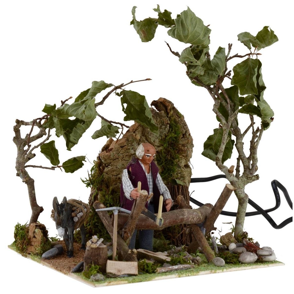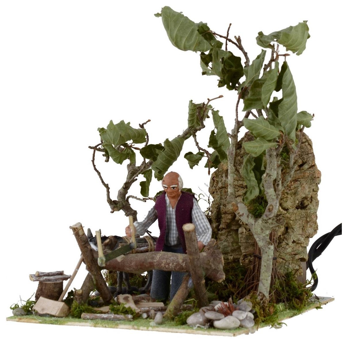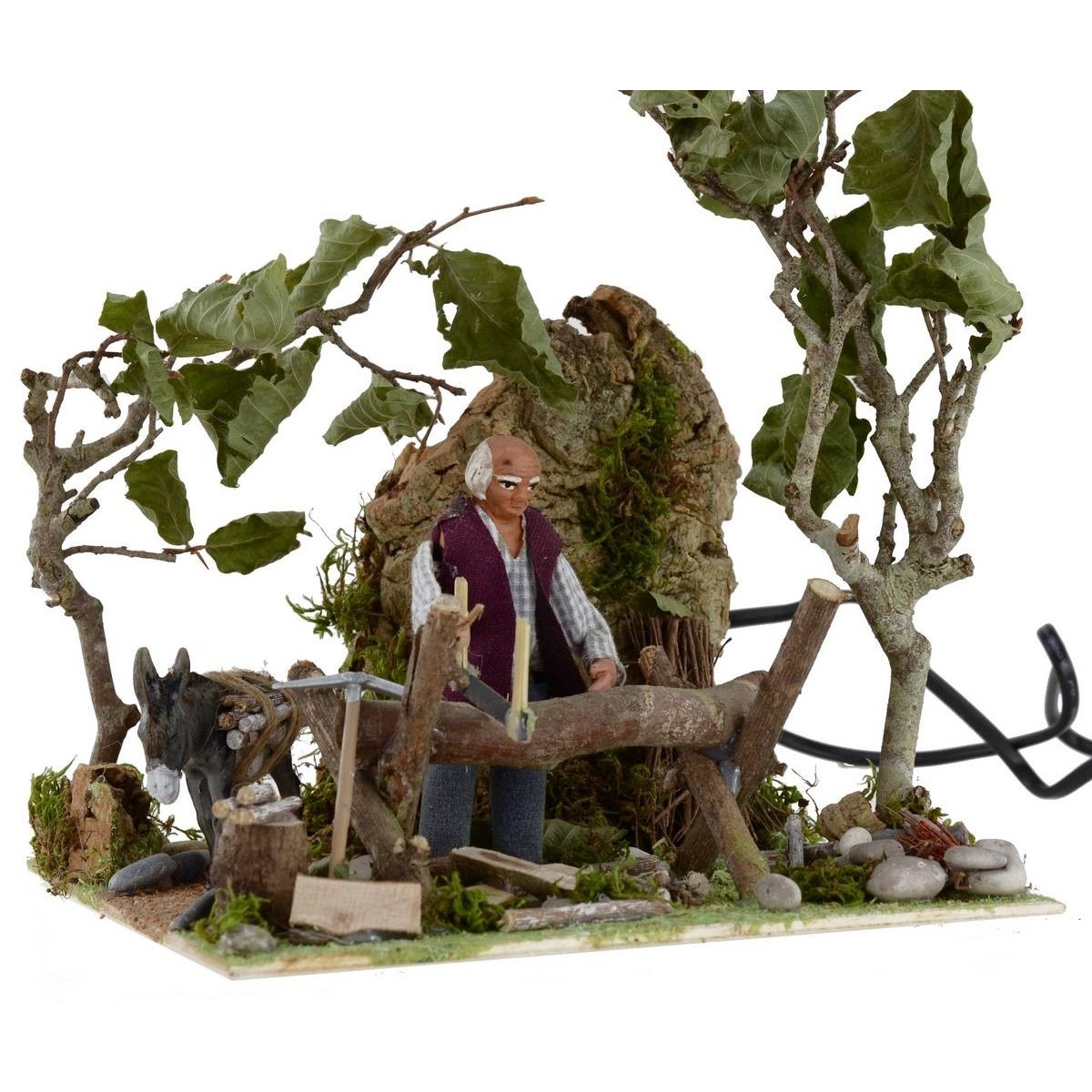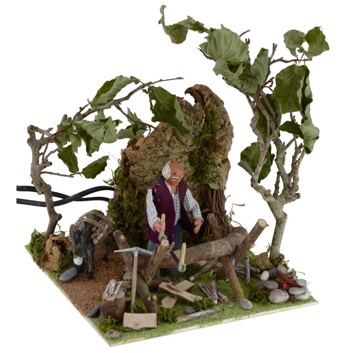 Leñador en movimiento con fuego que funciona con corriente. La escena está llena de detalles: en primer plano vemos al hombre, de pie, concentrado en serrar un tronco de madera y, gracias al movimiento del torso hacia adelante y hacia atrás, simula precisamente la acción de cortar el tronco. Otros elementos característicos de la escena son la densa vegetación circundante y los numerosos elementos naturales de un paisaje, que hacen que la escenografía sea muy sugestiva y realista. Detrás del leñador hay un burro con haces de leña. Aporta una mayor sugestividad el brasero provisto de fuego que funciona con corriente. La estatua está realizada en terracota y pintada a mano en Italia por manos artesanas con ropas de tela y está equipada con dos enchufes que funcionan con corriente. La estatua para el Pesebre clásico y/o napolitano mide 10 cm y se caracteriza por el uso de materiales como la madera, el corcho, la tela y la terracota; forma parte de la serie de estatuas de 10 cm.