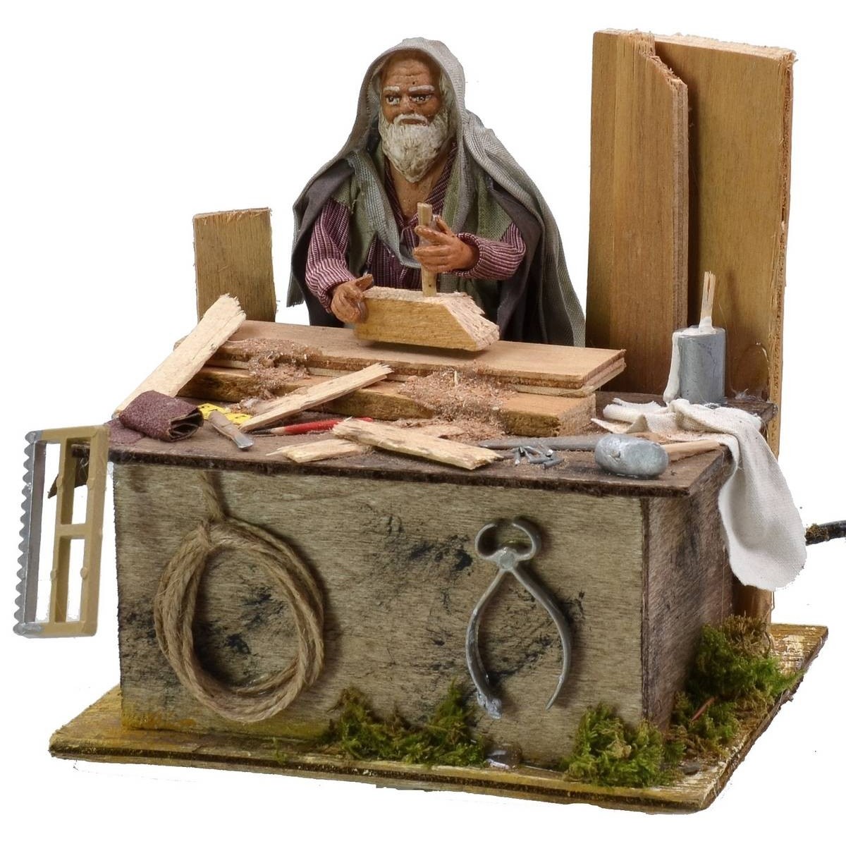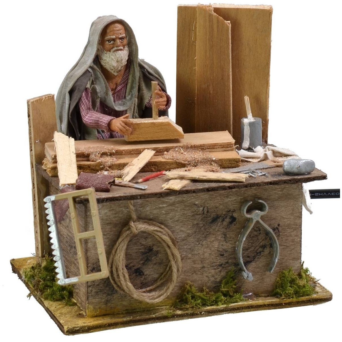 Carpintero en movimiento, funcionando con corriente. La escena está llena de detalles: en primer plano vemos al hombre, de pie, dedicado a cepillar madera. Alrededor del personaje, colocados en el banco de trabajo, hay múltiples piezas pequeñas de materiales y herramientas de trabajo cuidadas en los más mínimos detalles. La estatua está hecha de terracota y pintada a mano en Italia por manos artesanas con ropa de tela y está equipada con un enchufe que funciona con corriente. La estatua para el Belén clásico y/o napolitano mide 13 cm y se caracteriza por el uso de materiales como la madera, el corcho, la tela y la terracota; forma parte de la serie de estatuas de 12 cm.