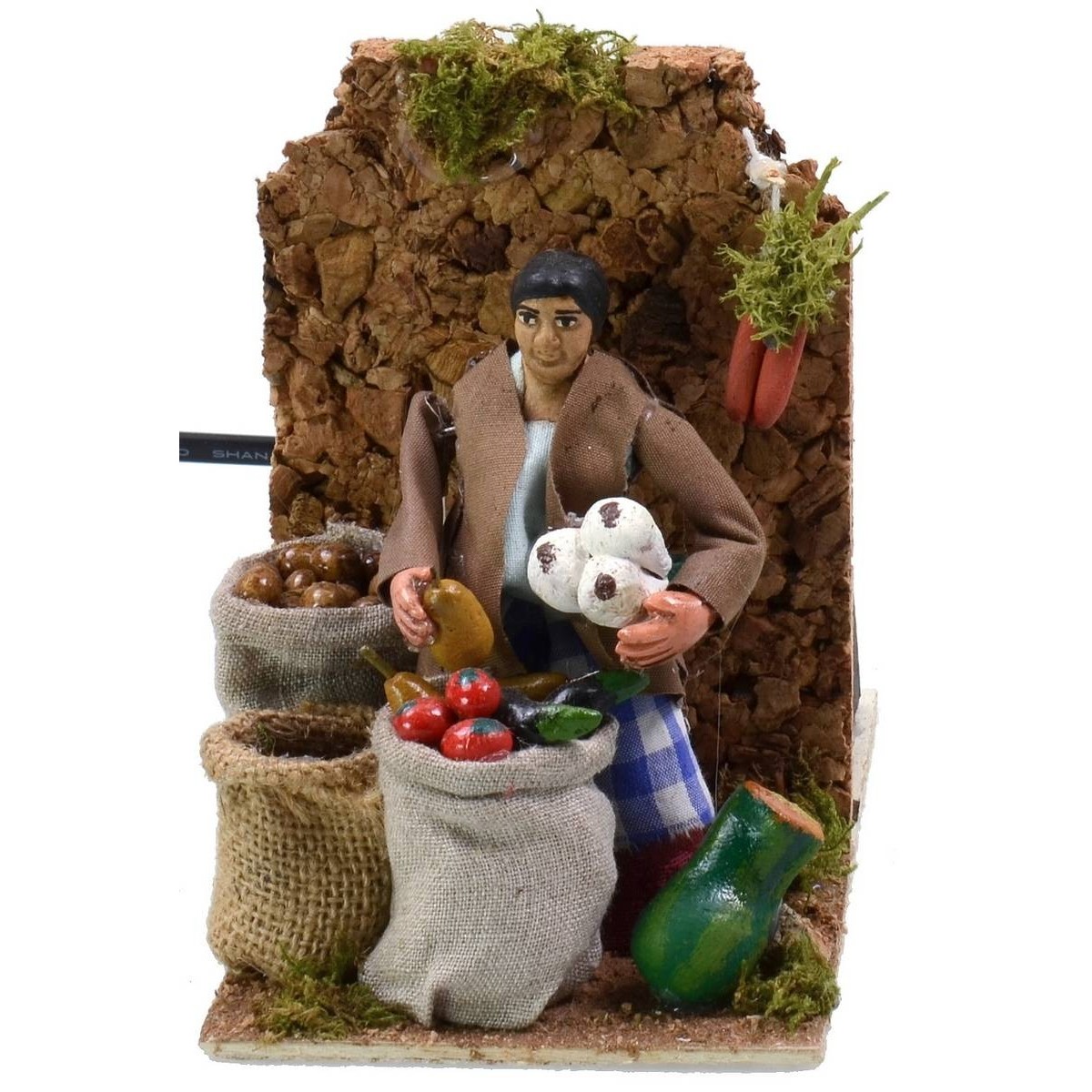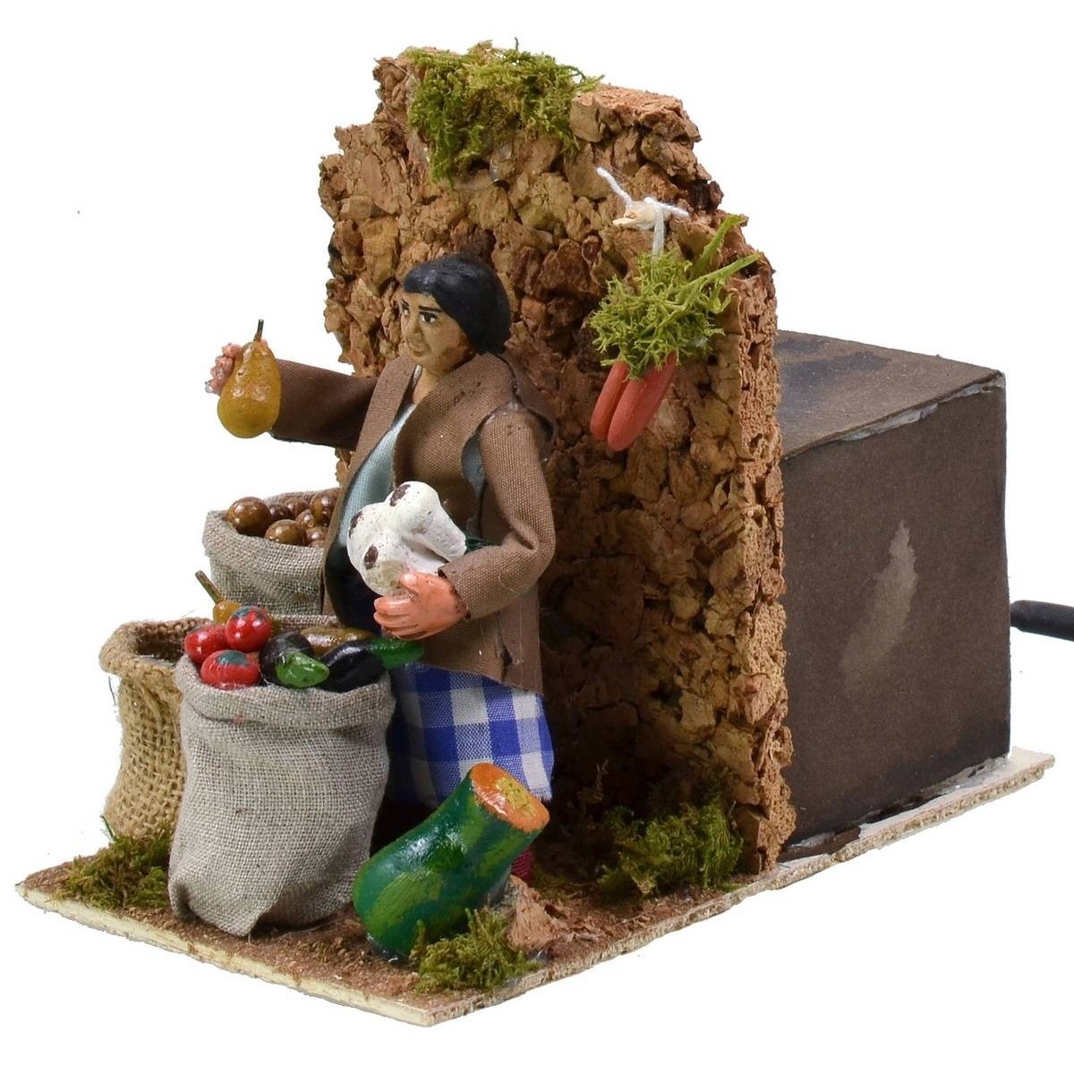 Vendedora de frutas en movimiento, funcionando con corriente. La escena está llena de detalles: en primer plano vemos a la mujer, de pie, ocupada vendiendo mercancía; alrededor del personaje y en los sacos debajo hay múltiples miniaturas de frutas y verduras cuidadas al más mínimo detalle. La estatua está hecha de terracota y pintada a mano en Italia por manos artesanas con ropa de tela y está equipada con un enchufe que funciona con corriente. La estatua para el Belén clásico y/o napolitano mide 9 cm y se caracteriza por el uso de materiales como la madera, el corcho, la tela y la terracota; forma parte de la serie de estatuas de 10 cm.